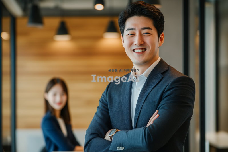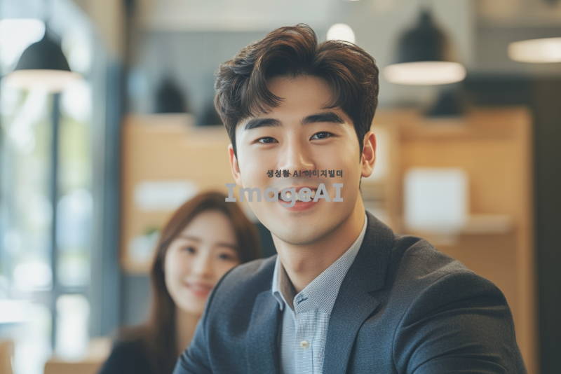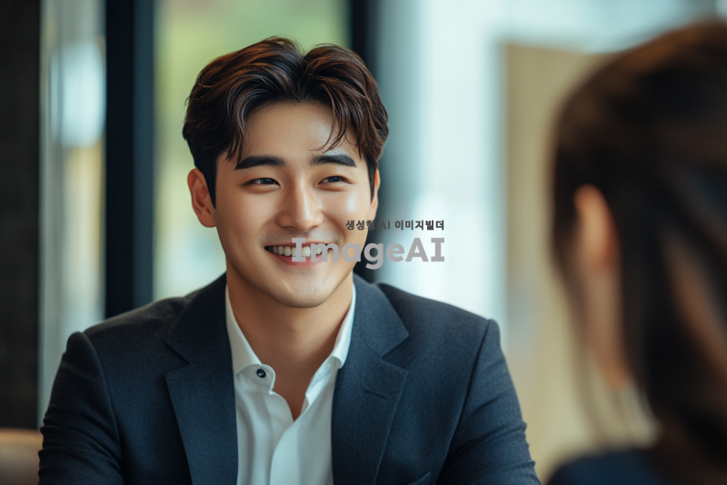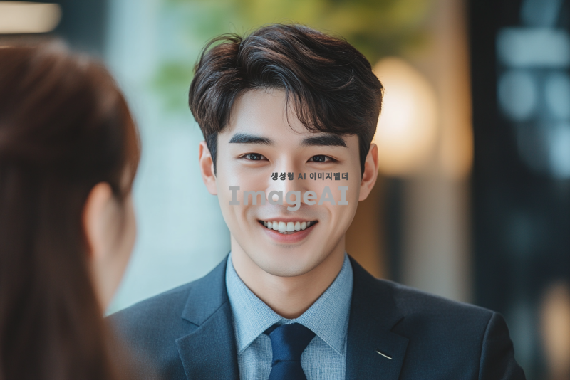 앞머리를 내린 단정한 헤어스타일을 한 잘생긴 30대 초반 한국인 남성이 정장을 입고 고급시계를 착용한 모습. 그는 예쁜 여직원에게 상냥하게 대하며 미소를 짓고 있다. 배경은 현대적인 사무실 환경으로, 따뜻한 분위기가 느껴진다.