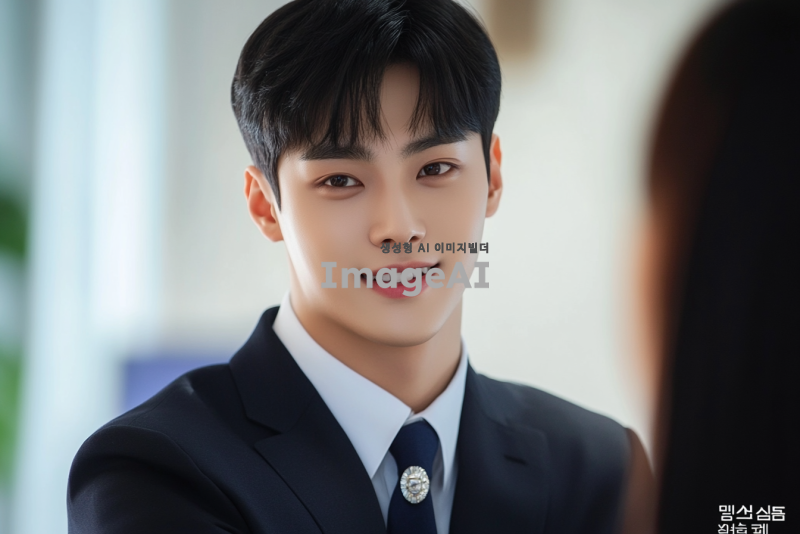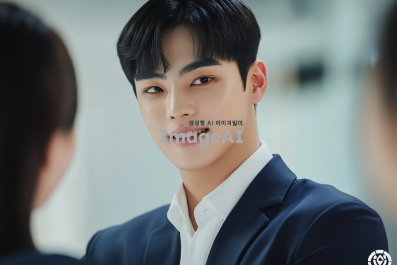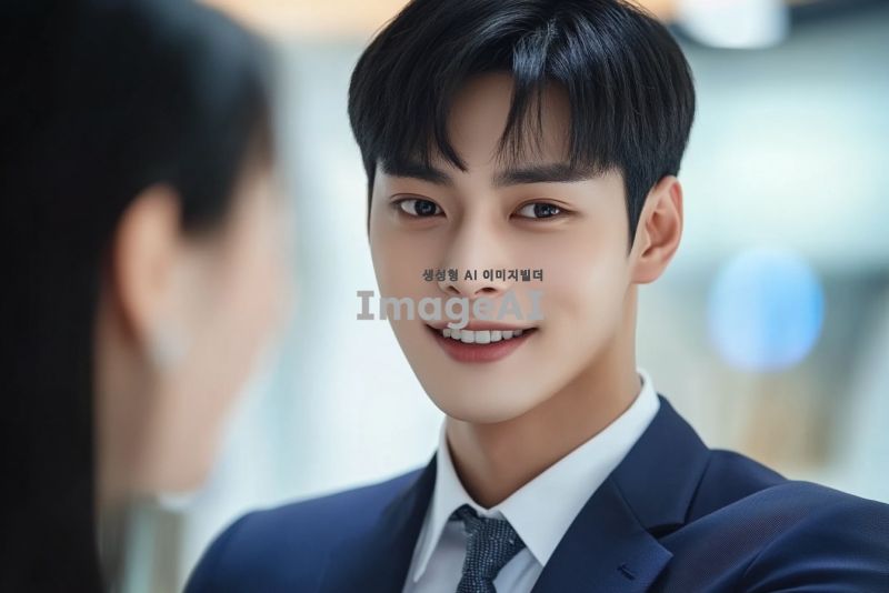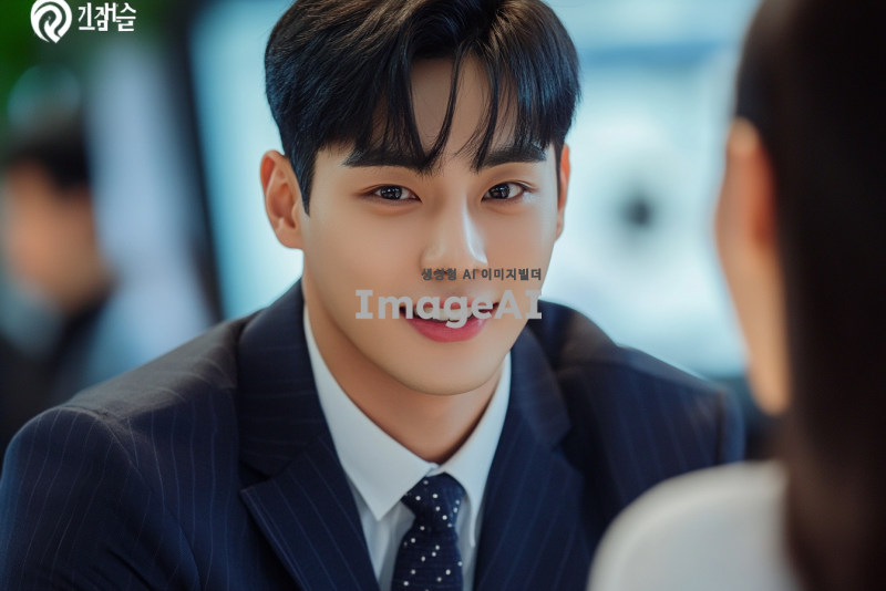 정장을 입고 고급 시계를 착용한 잘생긴 한국인 남성이 예쁜 여직원을 바라보며 미소짓고 있는 모습. 웨이스트샷으로 촬영된 장면, 배경은 사무실 환경으로 설정. 남성은 자신감 넘치는 표정과 함께 세련된 포즈를 취하고 있으며, 여직원은 밝은 미소로 응답하는 모습.