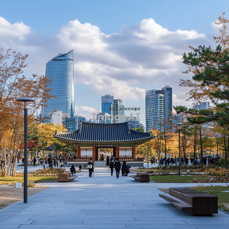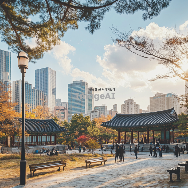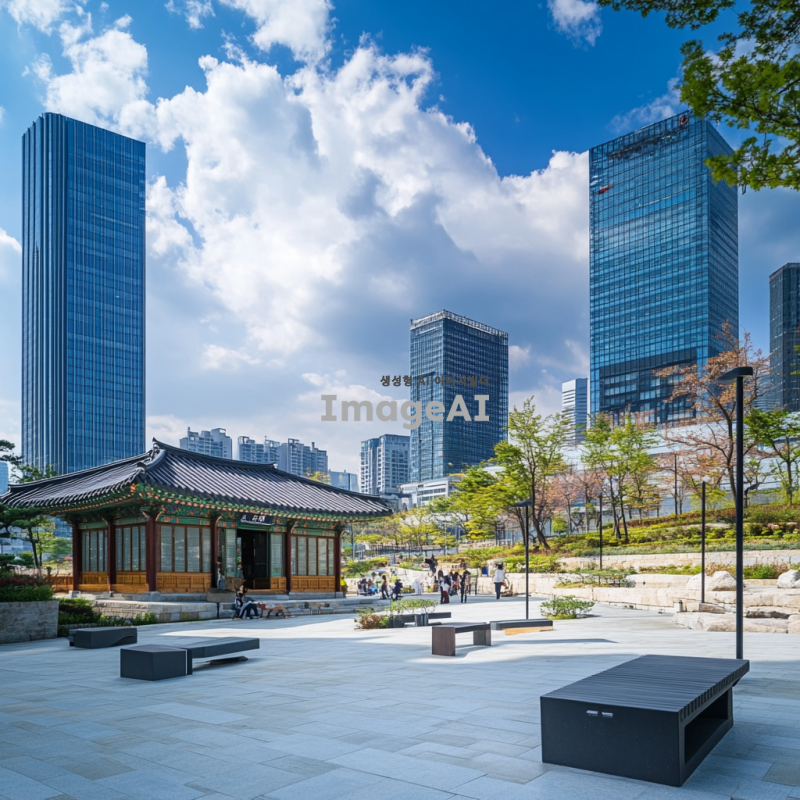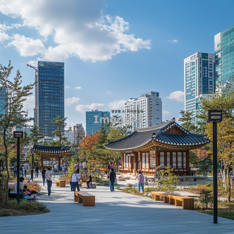 한국의 전통 건축 양식과 현대 건축이 조화를 이루는 도시 풍경, 한옥과 현대적인 고층 건물이 함께 있는 모습, 푸른 하늘과 구름이 어우러진 배경, 사람들은 건축물 주변에서 활동하며 소통하는 장면, 따뜻한 햇살이 비치는 날, 세련된 디자인의 거리 조명과 벤치가 있는 공원, 자연과 건축이 어우러진 아름다운 풍경.