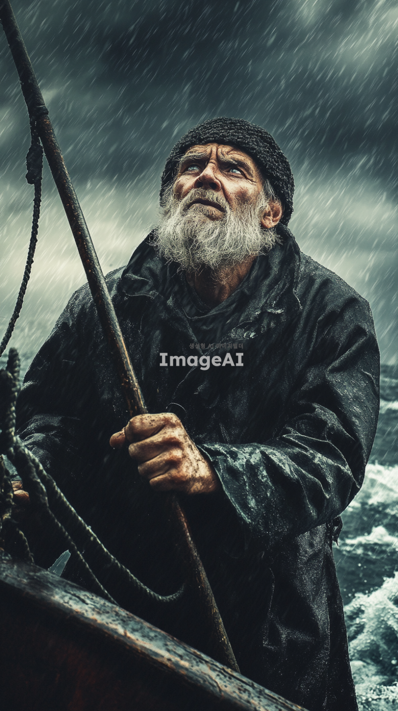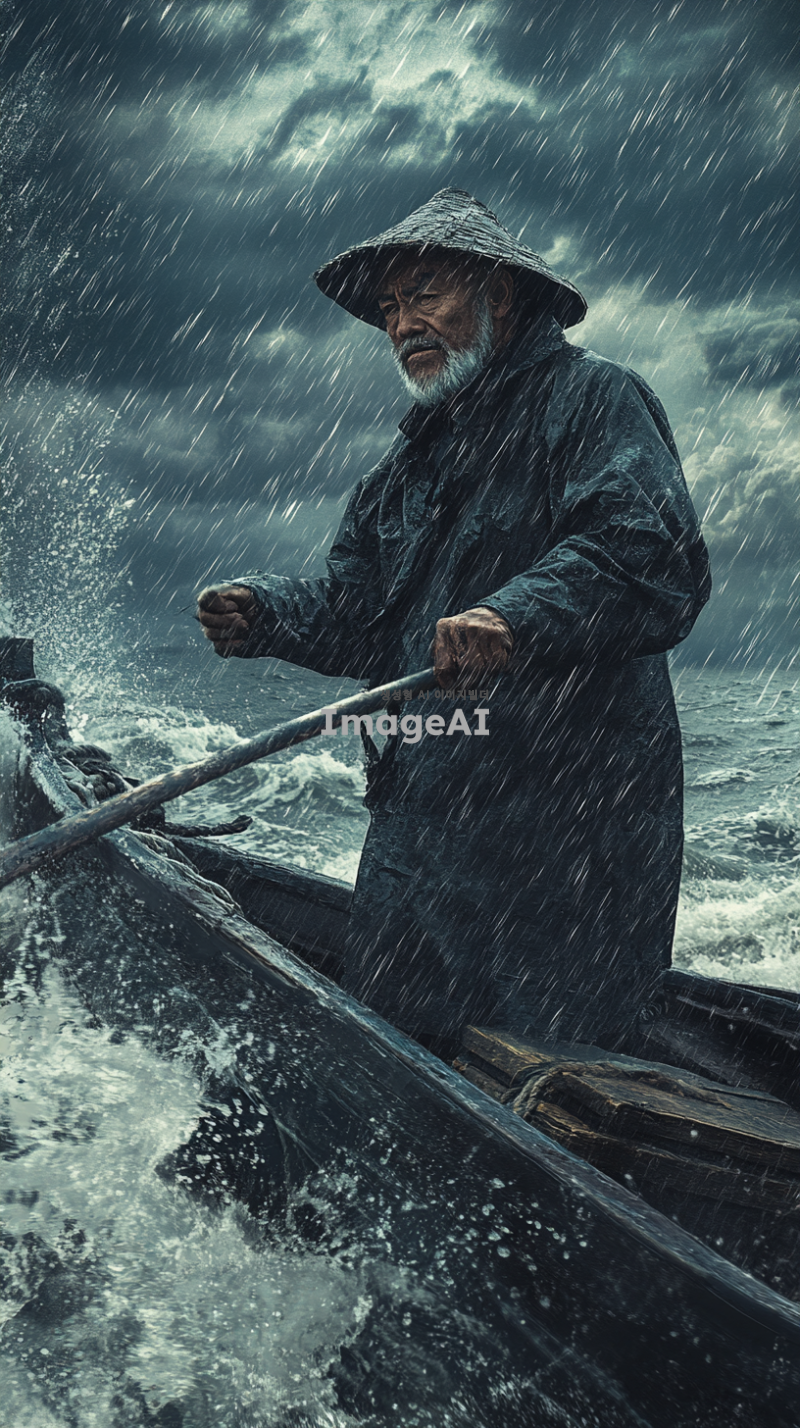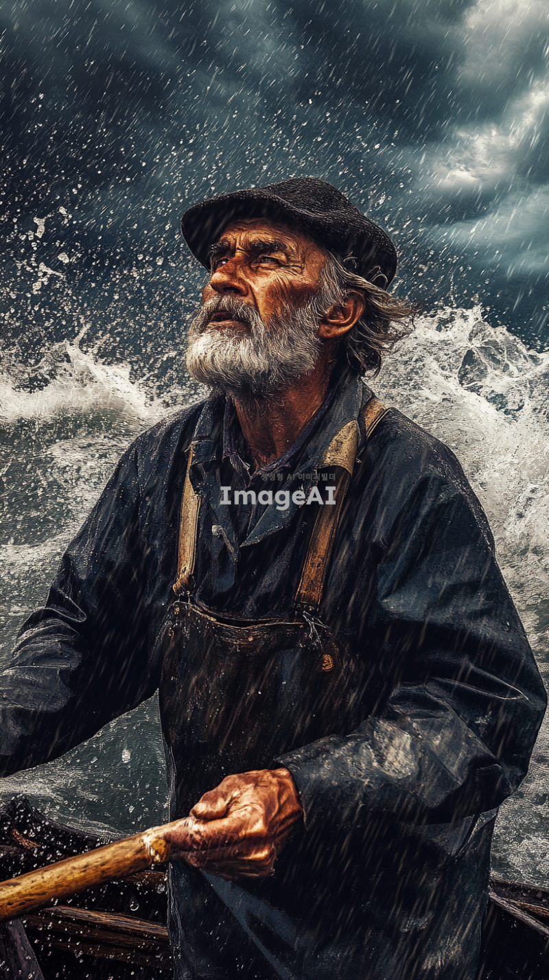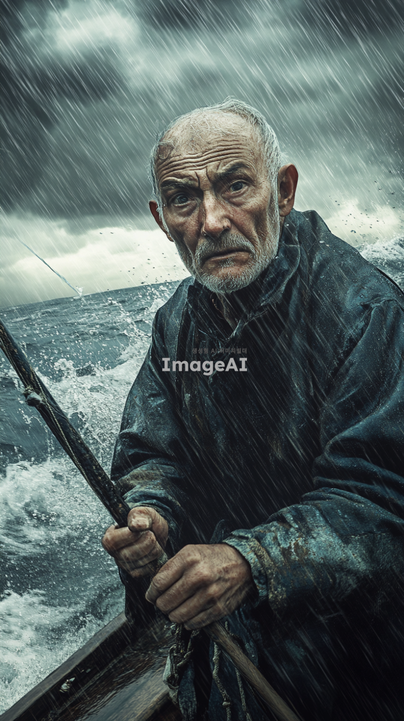 비가 내리는 바다 위, 배에 서 있는 늙은 어부가 작살을 들고 굳은 다짐을 하고 있는 모습. 어부의 얼굴에는 결연한 의지가 담겨 있으며, 물방울이 떨어지는 바다와 어두운 구름이 배경을 이루고 있다. 바람에 휘날리는 그의 옷자락과 함께 바다의 파도가 거세게 일렁이고 있다.