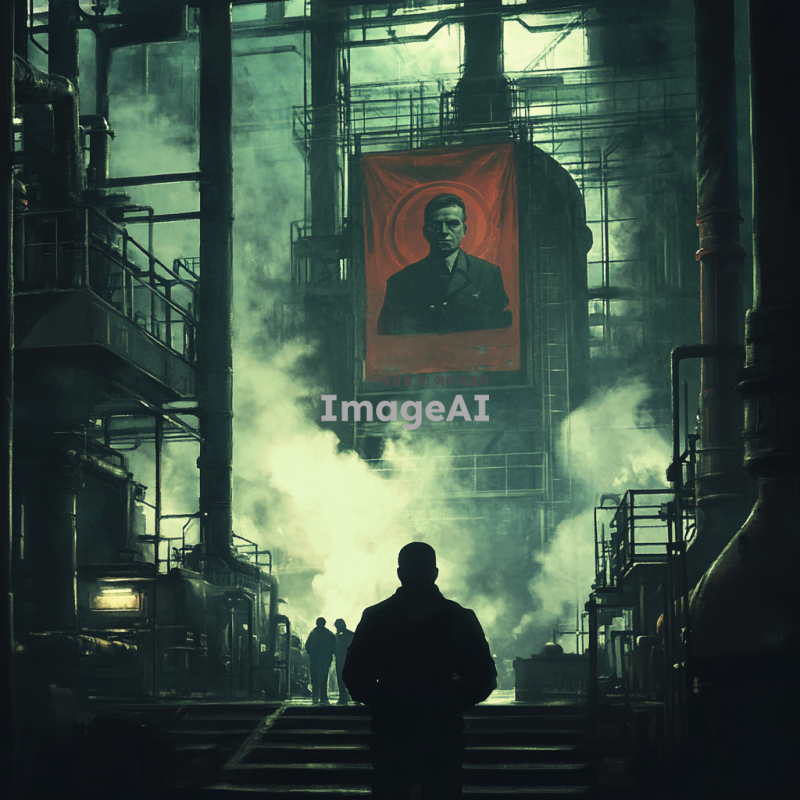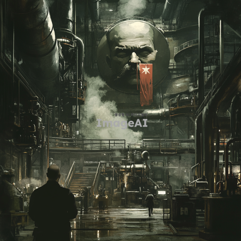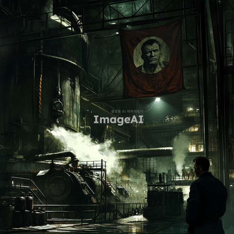 어두운 분위기의 독재정치 세계관, 공장 내부의 복잡한 기계와 노동자들, 주인공인 공장장이 결단을 내리는 순간, 결의에 찬 표정과 강렬한 눈빛, 배경에는 독재자의 포스터가 걸려있고, 그에 맞선 저항의 상징인 깃발이 보임, 전체적으로 긴장감 넘치는 색감과 조명, 스팀과 기계 소음이 느껴지는 환경, 게임의 스토리를 암시하는 요소들 포함.