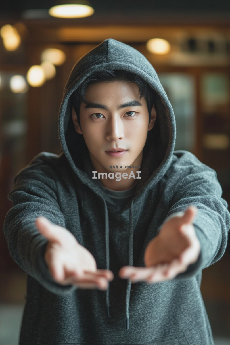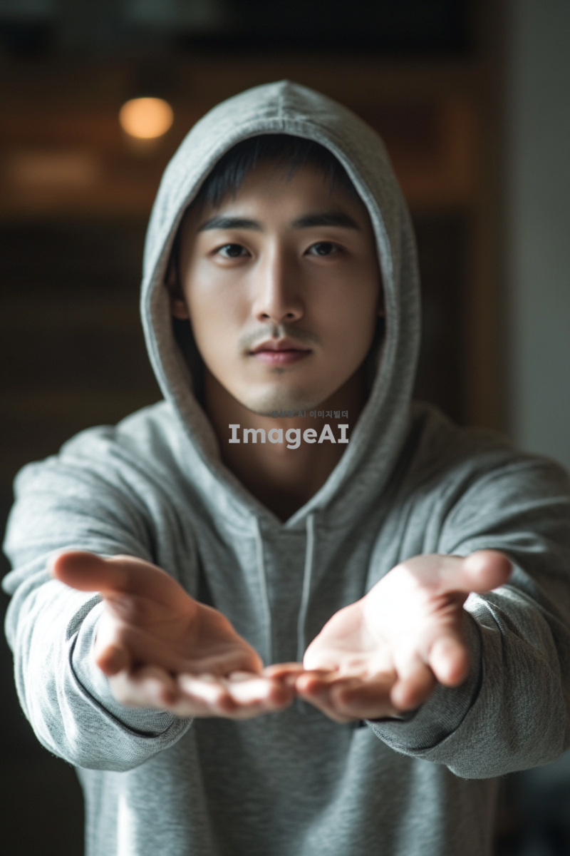 후드티를 뒤집어 쓴 잘생기고 순하게 생긴 한국남성. 손을 앞으로 뻗고 있음