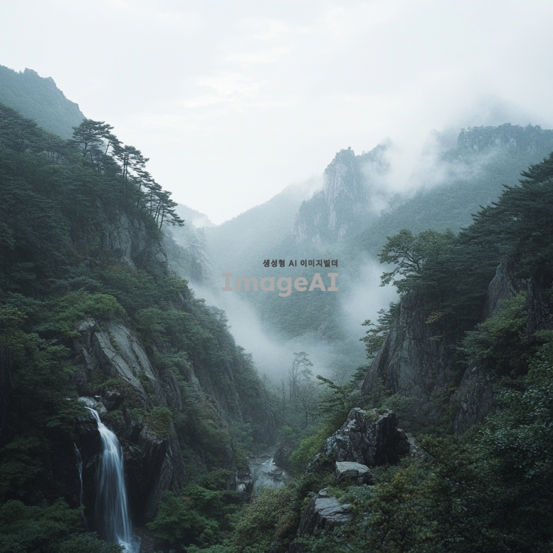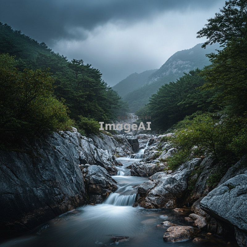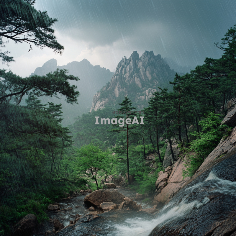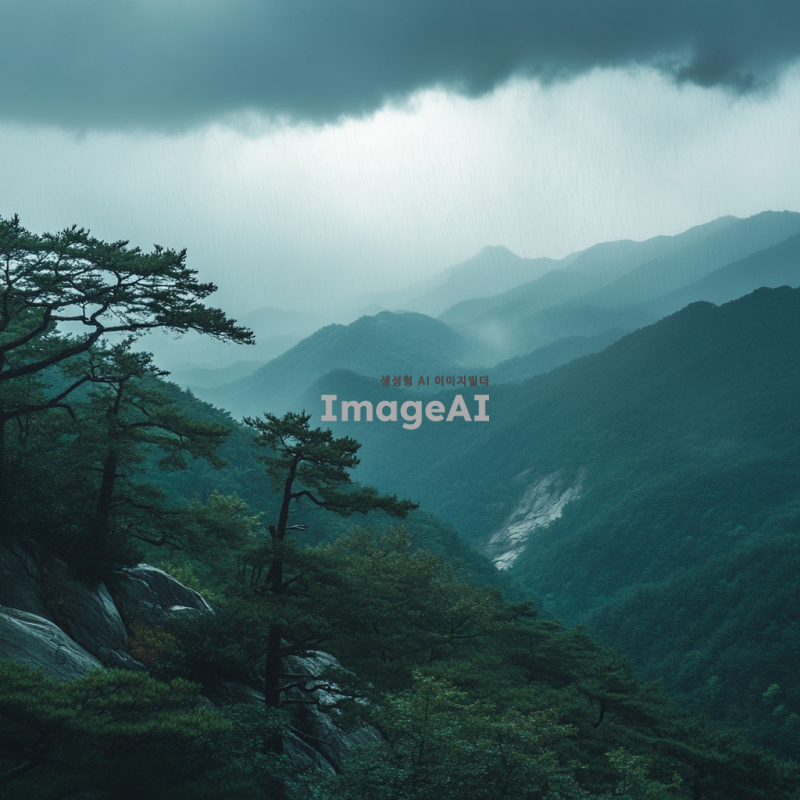 폭우가 쏟아지는 산의 풍경, 검은 구름이 가득한 하늘, 비가 내리는 모습이 강조된 자연의 힘, 나무와 바위가 물에 젖어 있는 모습, 물이 흐르는 계곡, 흐릿한 경치 속에서의 신비로운 분위기, 한국의 산악 지역을 배경으로 한 장면