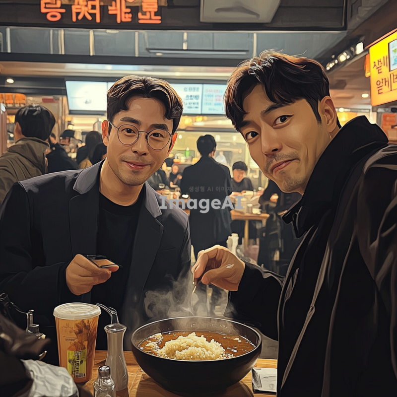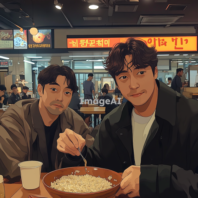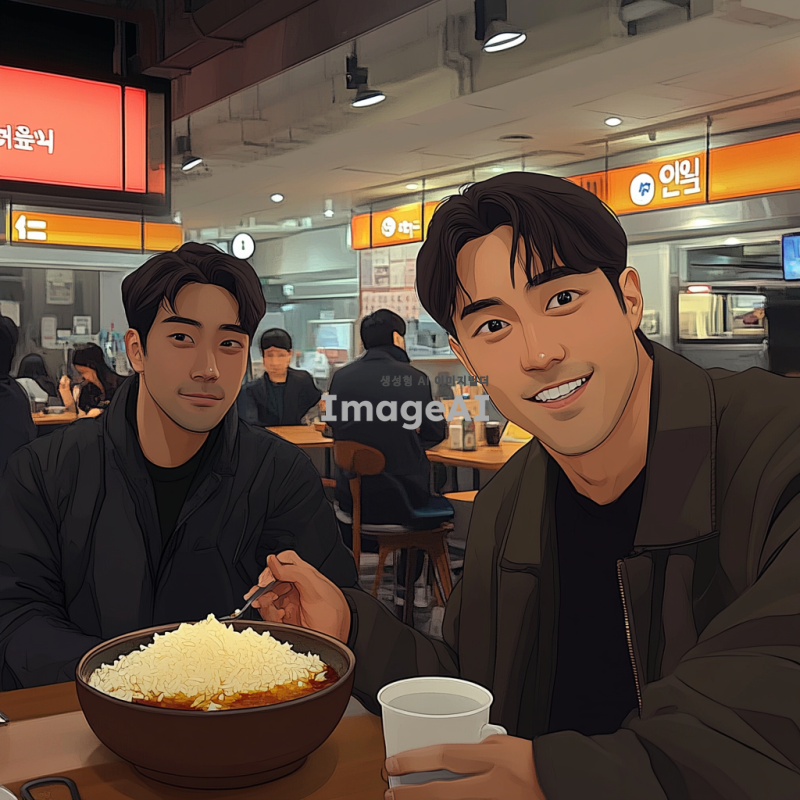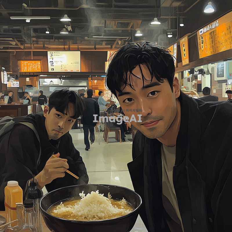 친구가 건너편에서 친구의 설렁탕 뚝배기에 밥 말려다가 밥공기 채로 떨어트려서 국물이 남자 옷에 다 튀었고, 남자는 코트를 입고 있었고 국물이 코트위에 다 튄 사진 만들어줘