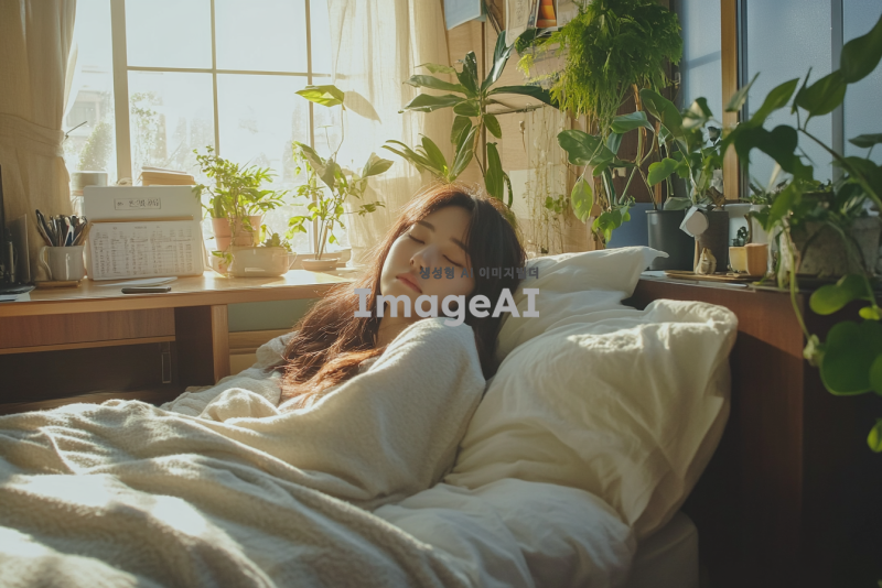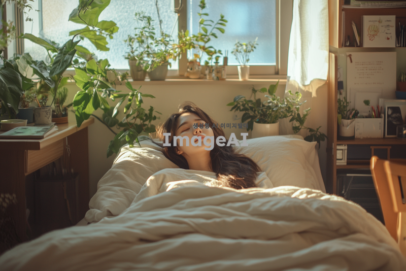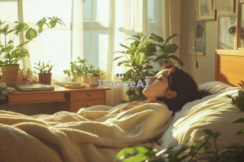 아침 햇살이 비치는 방 안, 침대에서 자고 있던 한국인 여성이 천천히 눈을 뜨고 몸을 일으키는 모습. 부드러운 이불과 아늑한 침대, 주변에 놓인 작은 책상과 식물, 여자의 표정은 편안하고 상쾌하며, 머리는 살짝 헝클어진 모습. 자연광이 방 안을 따뜻하게 감싸고 있는 장면.