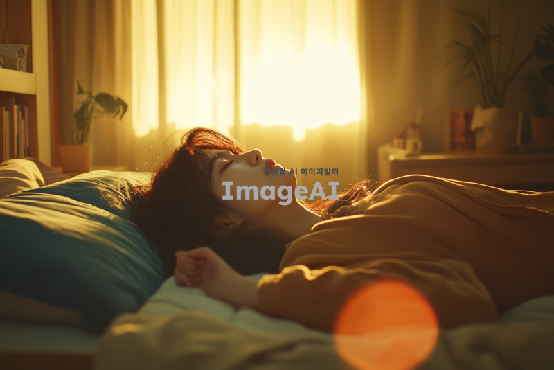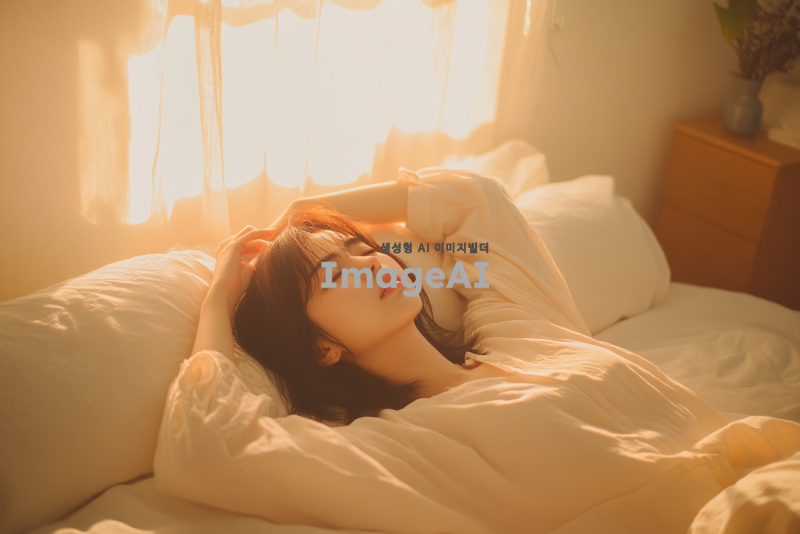 아침 햇살이 비치는 방 안에서 침대에 누워 있는 한국인 여성, 기지개를 켜며 상반신을 일으키는 모습, 부드러운 침대 이불과 아늑한 인테리어, 편안한 표정과 여유로운 분위기, 따뜻한 색감의 조명.