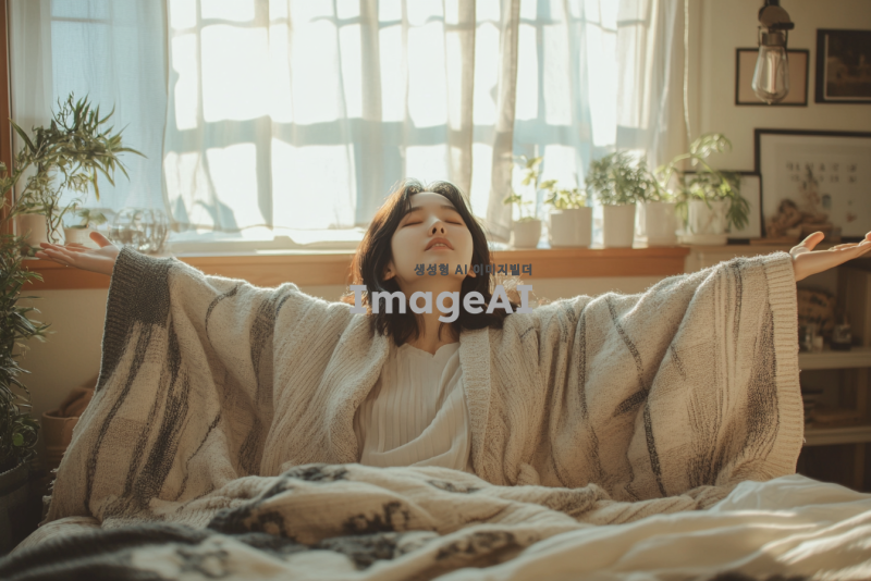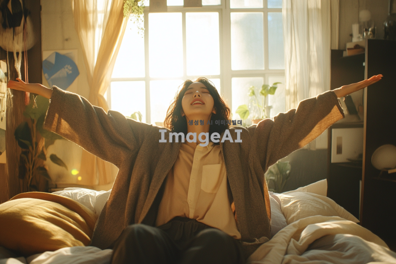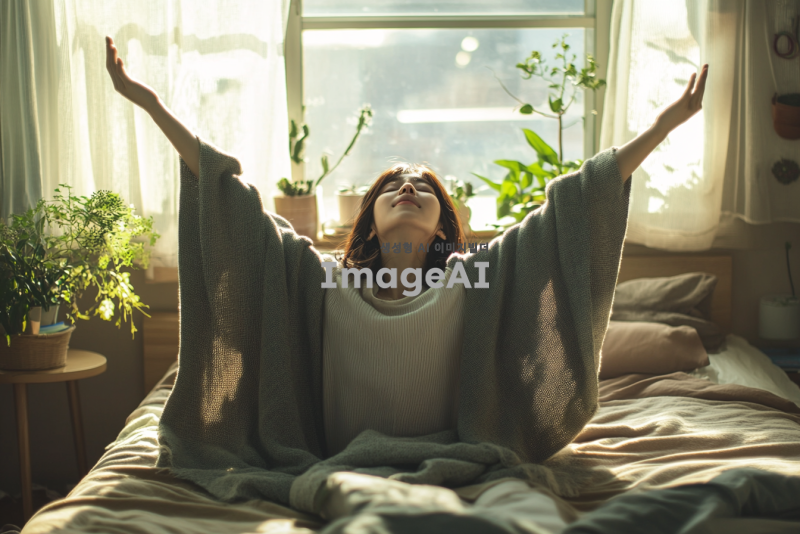 아침 햇살이 비추는 방 안, 침대 위에 이불을 덮고 앉아 있는 한국인 여성. 그녀는 양팔을 쭉 뻗으며 기지개를 켜고 있고, 얼굴은 잠을 덜 깬 표정. 주변은 아늑한 분위기로 꾸며져 있다