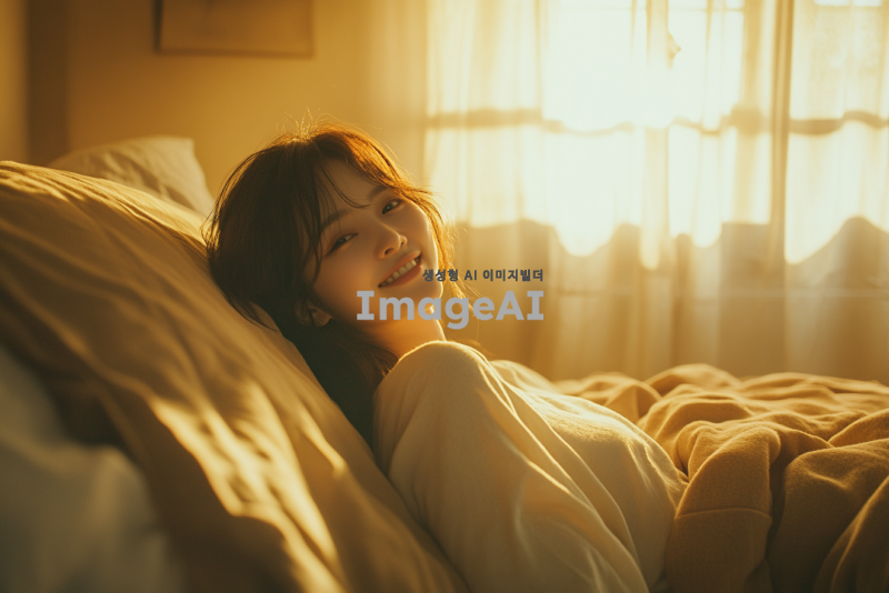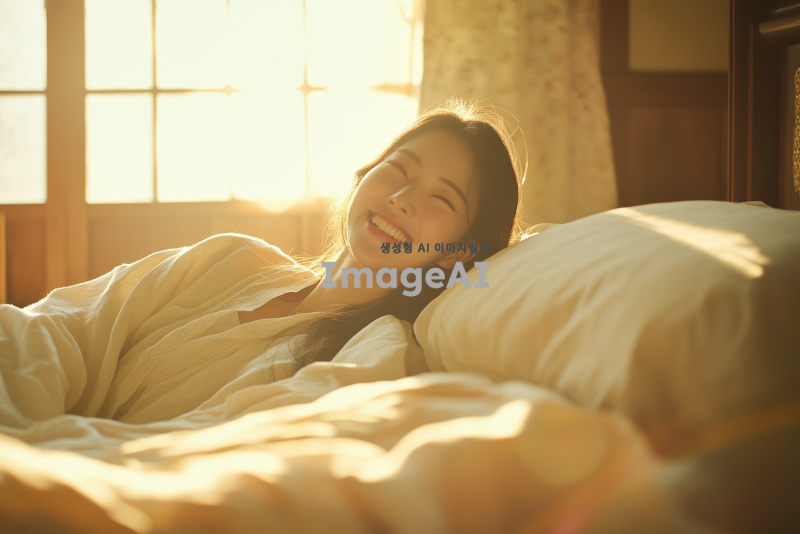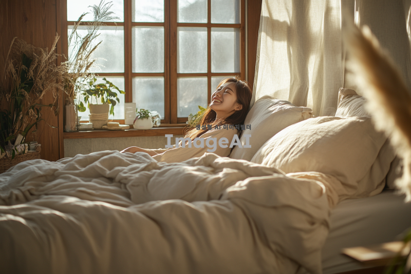 침대에서 잠을 깨고 일어나는 한국인 여성, 부드러운 아침 햇살이 방 안으로 들어오고, 편안한 침대 시트와 아늑한 베개, 여성이 미소 지으며 일어나는 모습, 자연스러운 표정과 포즈, 따뜻한 색감의 아침 풍경.
