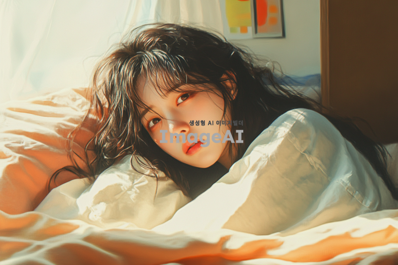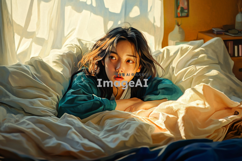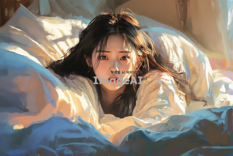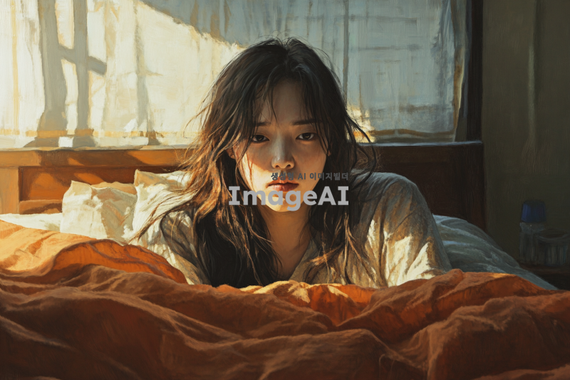 침대에서 일어난 한국인 여성, 퀭한 얼굴과 피곤한 눈빛, 머리는 헝클어져 있고, 침대 이불은 어지럽혀져 있음, 아침 햇살이 방 안으로 비추고 있는 모습, 주변은 따뜻하고 아늑한 분위기, 감정이 담긴 표정, 현실적이고 생동감 있는 스타일.