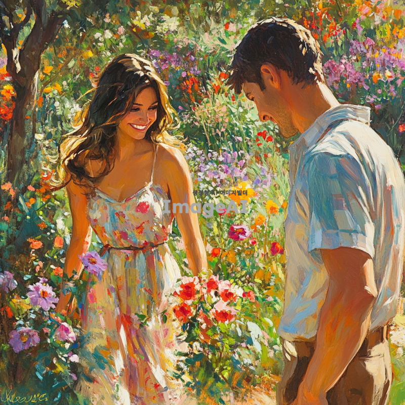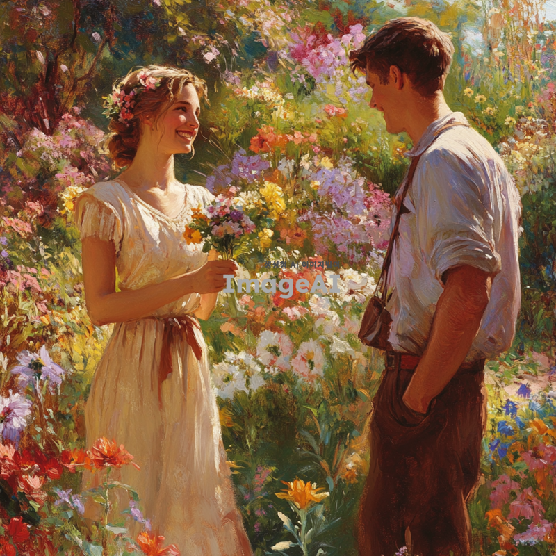 꽃밭에서 화사한 꽃들 사이로 한 여자가 예쁜 꽃을 손에 들고 웃으며 남자에게 다가오는 모습. 배경에는 다양한 색상의 꽃들이 만개해 있고, 따뜻한 햇살이 비추는 평화로운 풍경. 여자는 화사한 드레스를 입고 있으며, 남자는 편안한 복장으로 그녀를 바라보며 미소 짓고 있는 장면.