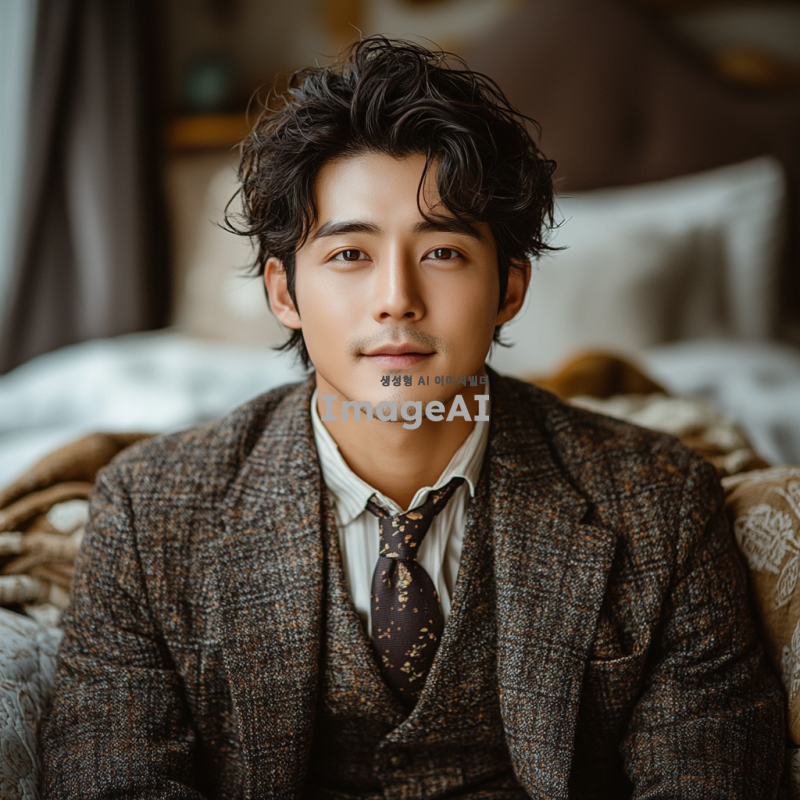 30대 한국 남성이 넥타이를 물고 있는 모습, 세련된 정장 차림, 침대, 자신감 넘치는 표정, 자연광이 비치는 분위기, 포커스가 잘 맞춰진 이미지