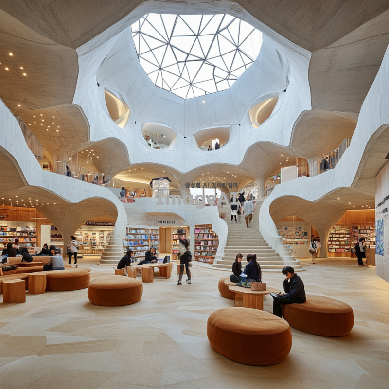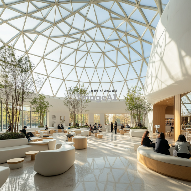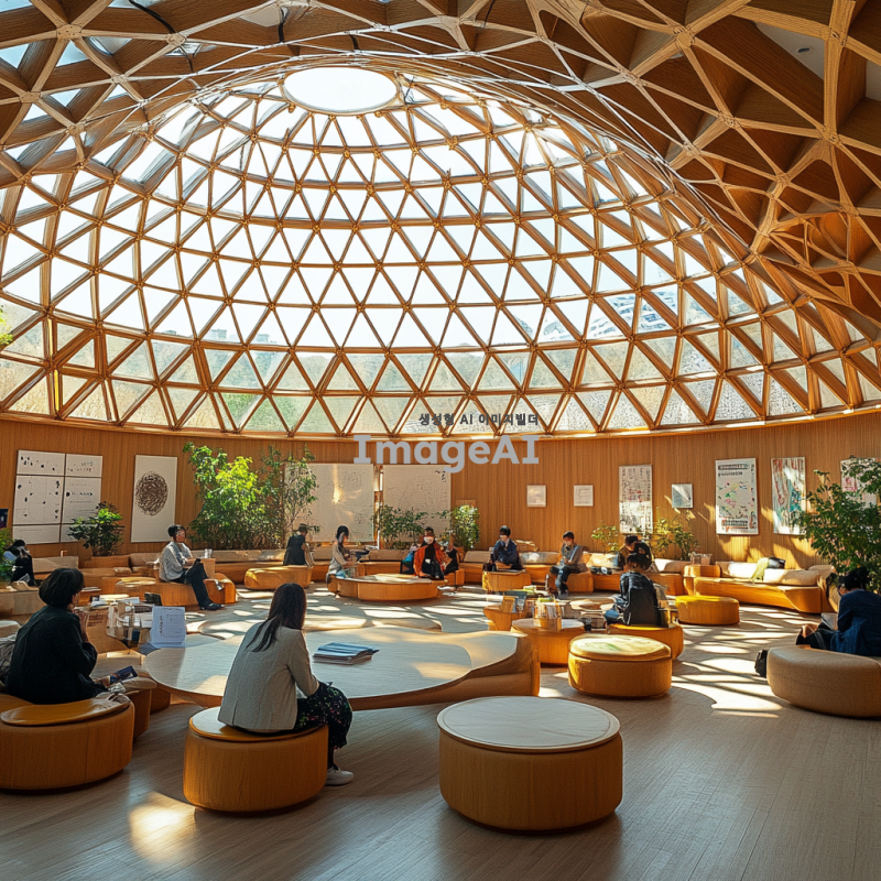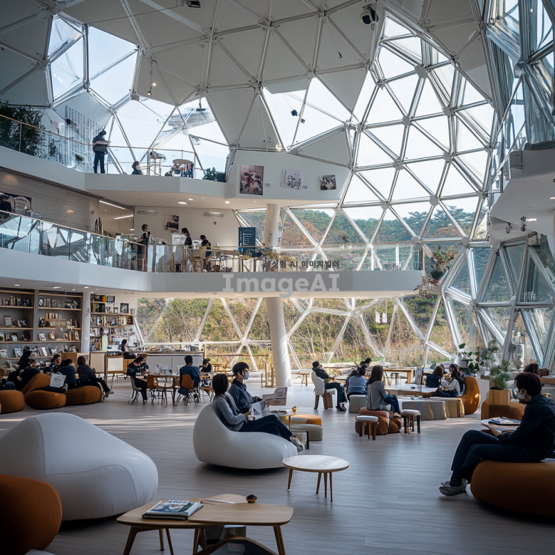 기하학적인 돔구조 복합문화센터의 내부, 현대적이고 세련된 디자인, 자연광이 들어오는 넓은 공간, 다양한 문화 활동을 위한 다목적 공간, 벽면에는 예술 작품과 설치 미술이 전시되어 있음, 편안한 좌석과 조화로운 색상 배치, 다양한 사람들의 활동 모습, 한국적인 요소가 가미된 현대적 감각, 따뜻하고 환영하는 분위기