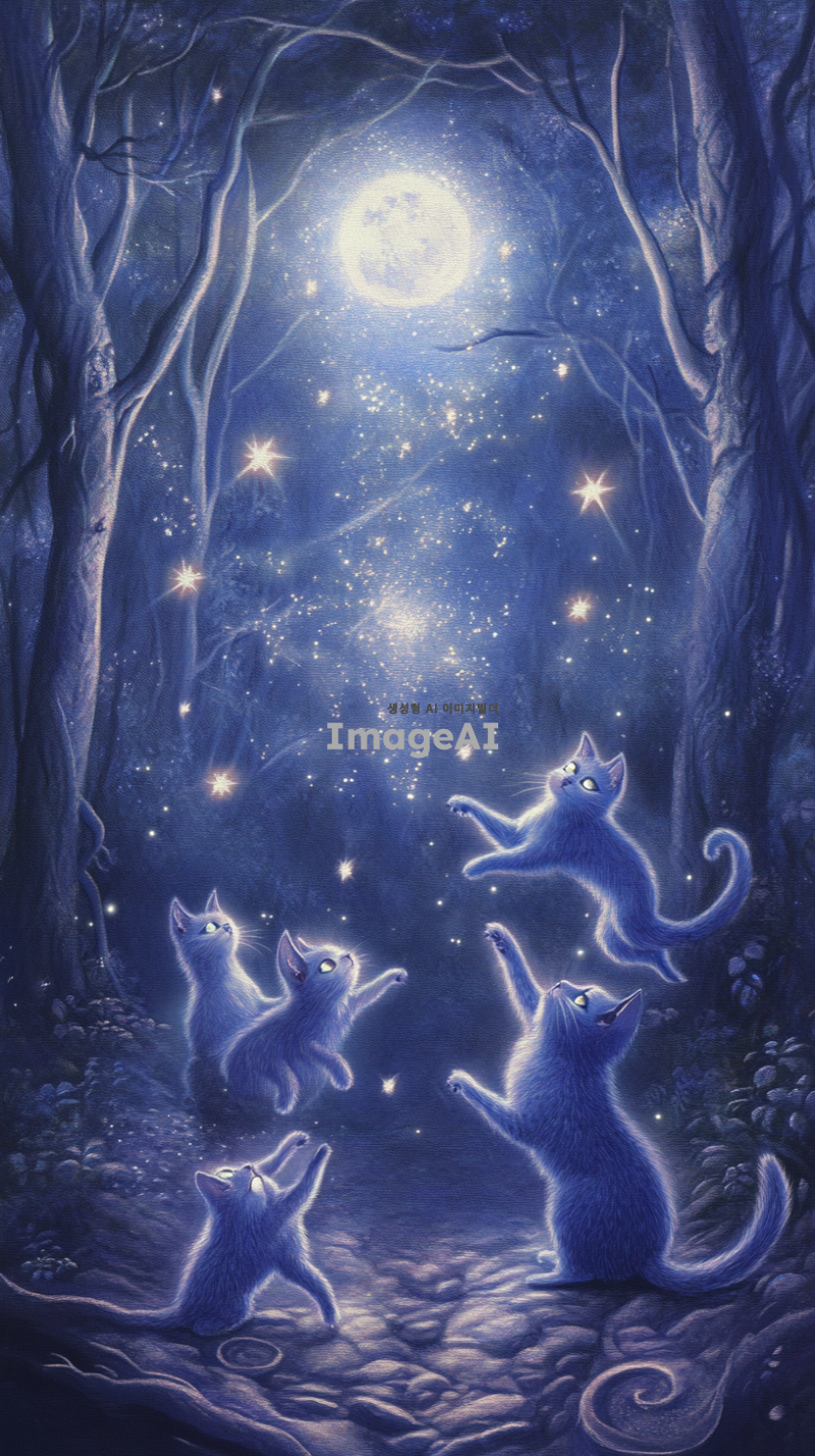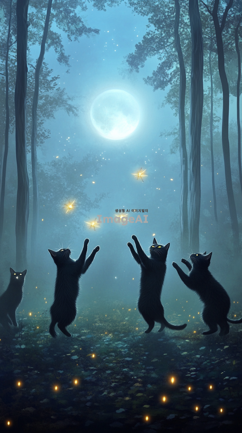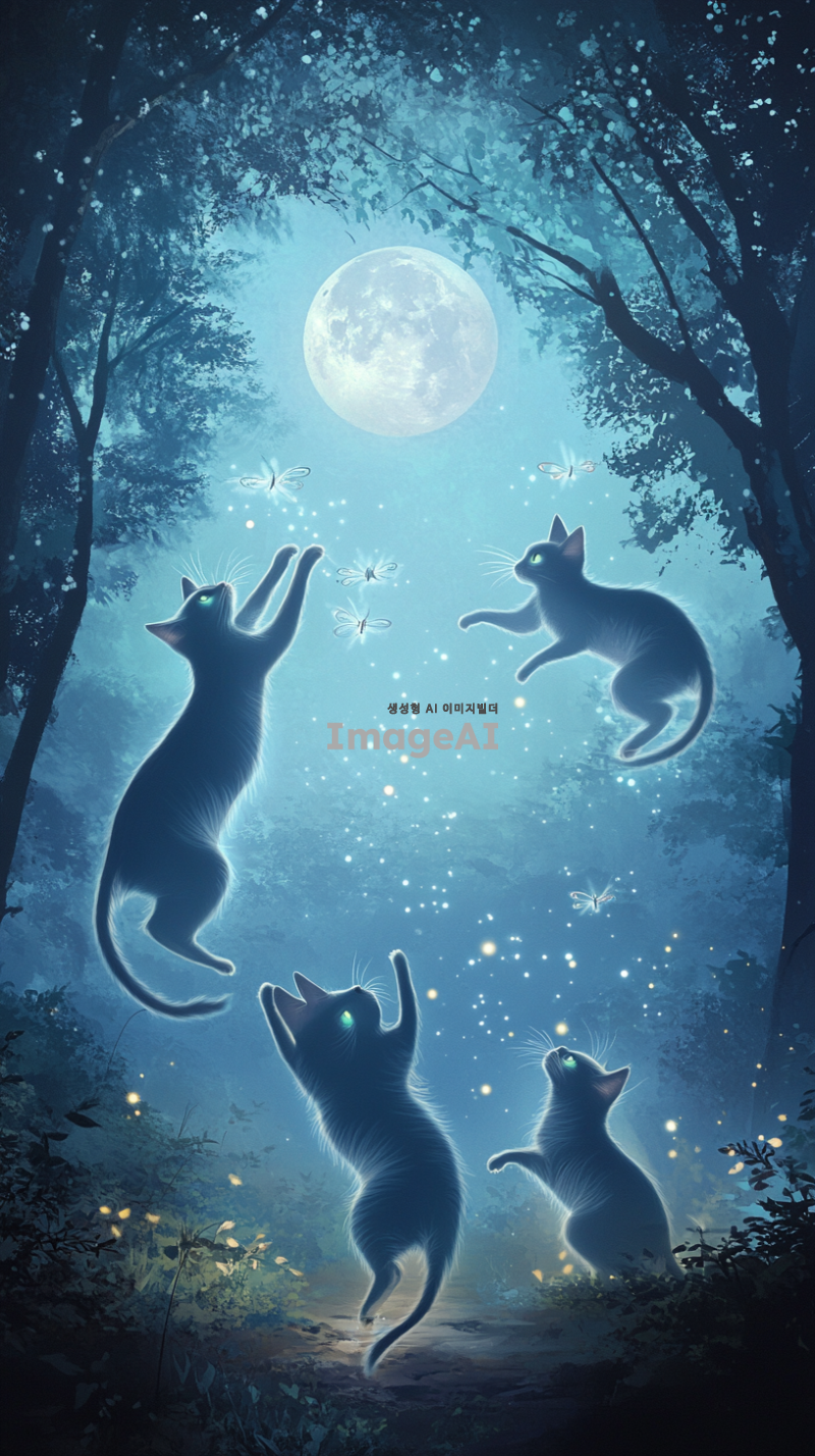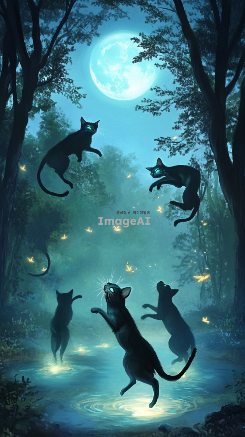 은은한 달빛이 비치는 마법의 숲속, 빛나는 눈을 가진 4마리 고양이가 신비로운 춤을 추고 있는 모습. 고양이들의 털은 달빛에 반사되어 약간 푸른 빛을 띠고 있으며, 주변에는 반딧불이가 춤을 추듯 떠다니고 있다. 고양이들은 고대 의식을 치르듯 원을 그리며 돌고, 가끔 한 마리씩 중앙으로 들어가 독특한 움직임을 선보인다. 뒷다리로 서서 달을 향해 앞발을 뻗거나, 공중으로 우아하게 점프하는 동작이 특징적이다. 고양이들이 움직일 때마다 발자국 위에 작은 마법의 빛이 반짝이고, 배경의 나무들은 달빛과 그림자로 신비로운 실루엣을 만든다. 전체적으로 몽환적이고 마법 같은 분위기가 강조되는 장면.