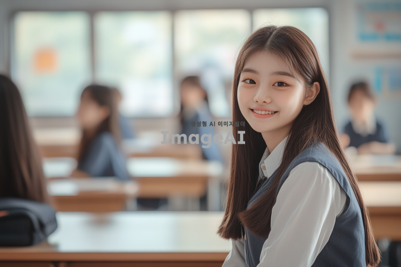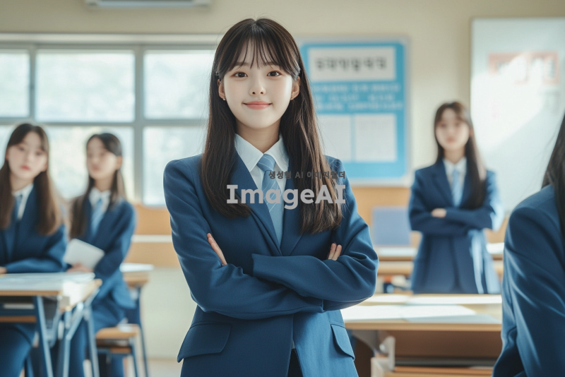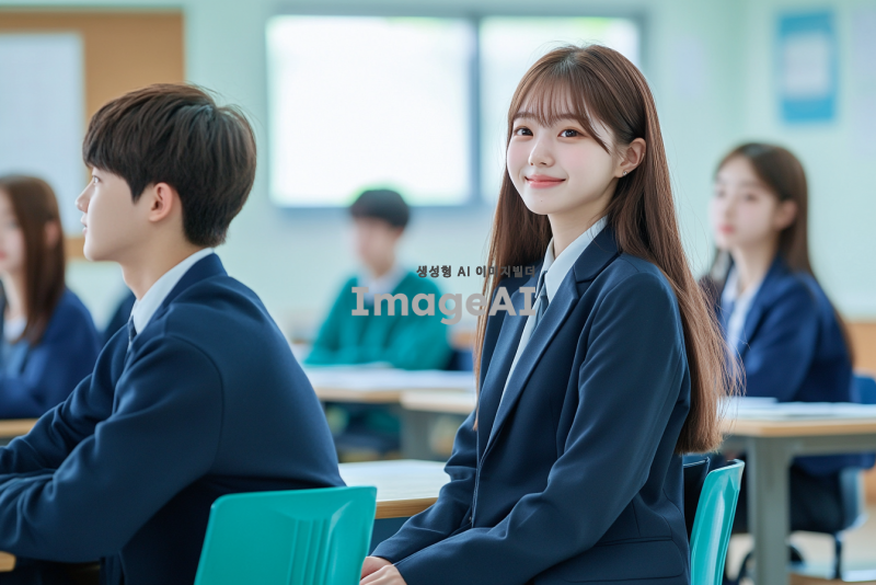 한국의 고등학교 학생들이 착용할 수 있는 현대적인 교복 디자인, 깔끔하고 세련된 스타일, 남학생은 단정한 블레이저와 슬랙스, 여학생은 우아한 블라우스와 스커트 조합, 색상은 파란색과 흰색을 기본으로 하며, 세부적인 패턴이나 로고는 포함하지 않음, 배경은 학교 교실 뒤쪽의 모습이 담기도록. 여학생 한명은 책상에 걸터앉은 모습으로.