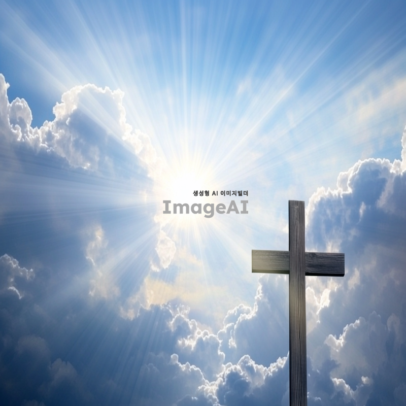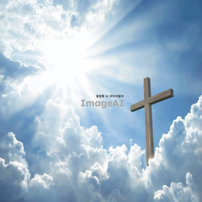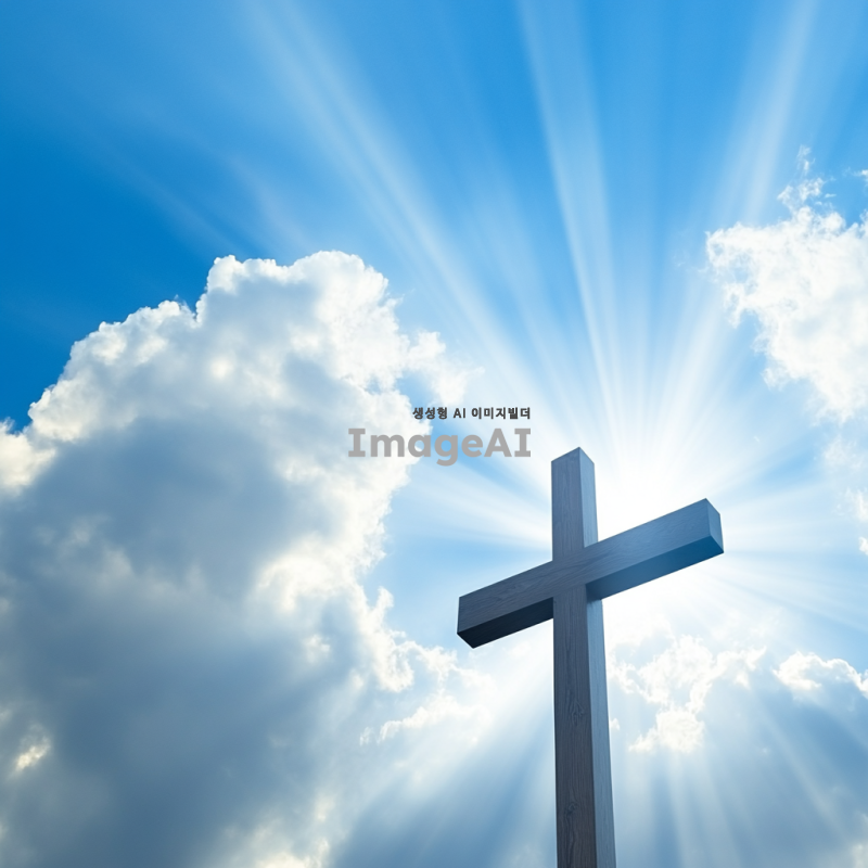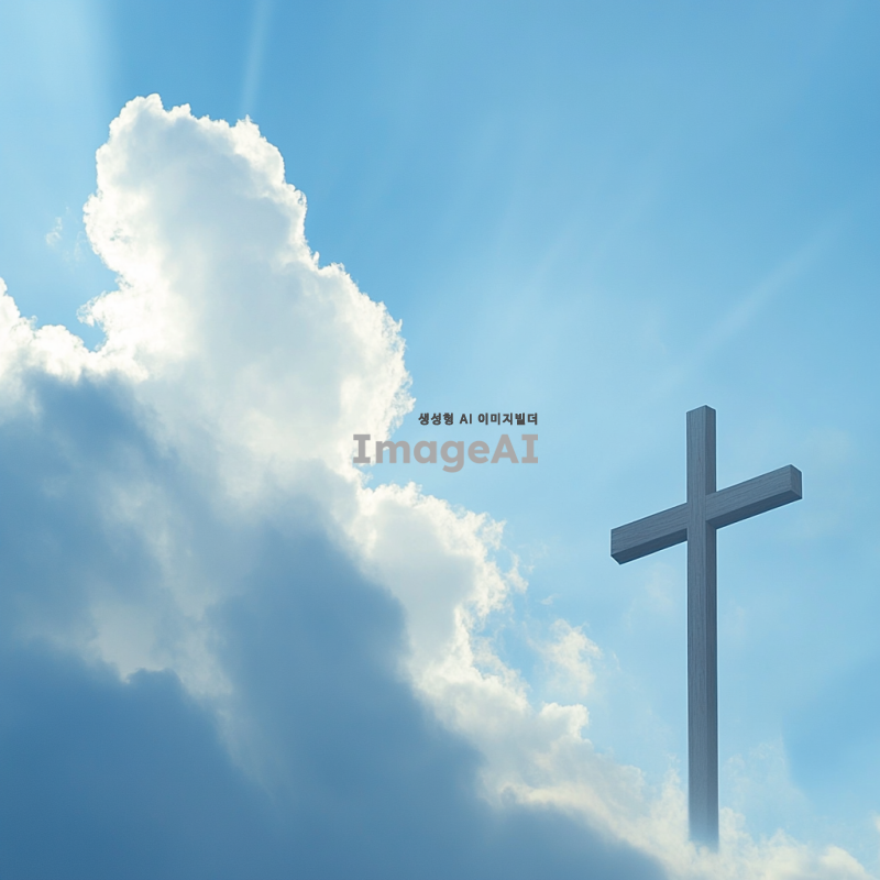 푸른 하늘에 흰 구름이 떠 있는 모습, 그 가운데 큰 나무 십자가가 우뚝 서 있는 장면. 햇살이 비추고 구름 사이로 빛이 스며드는 신비로운 분위기. 자연과 평화로움이 어우러진 풍경.