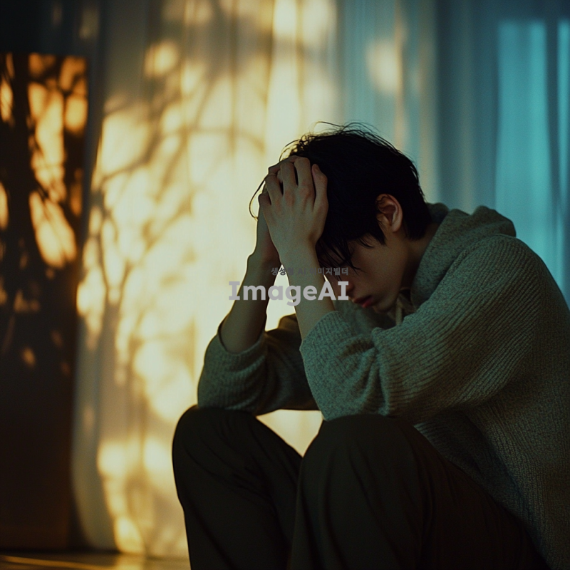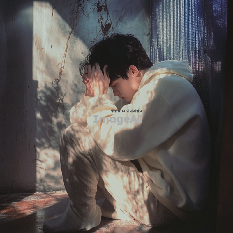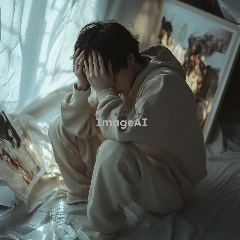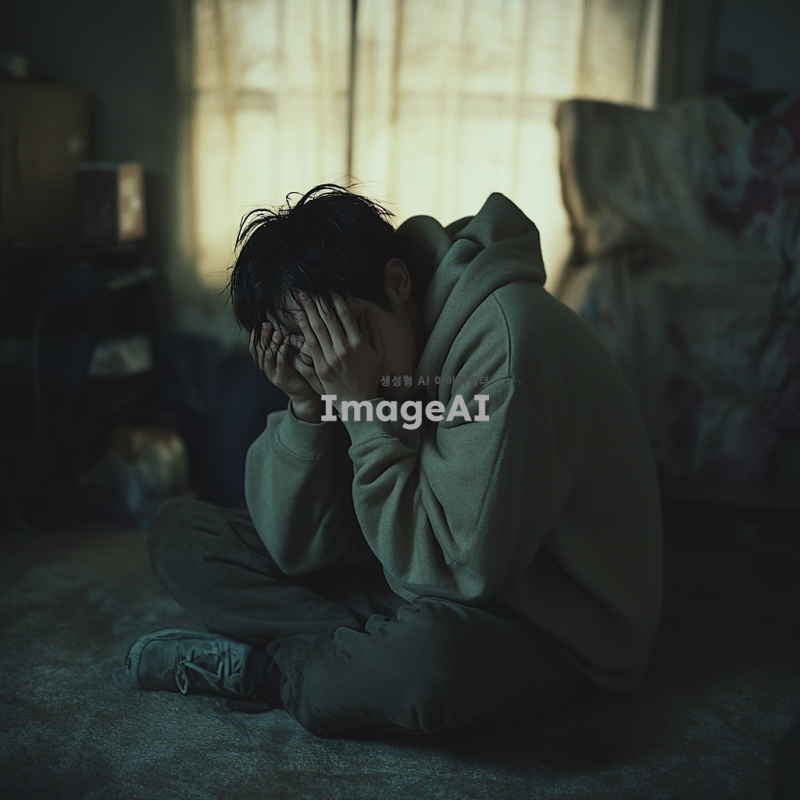 한적한 방 안에서 손으로 머리를 감싸안고 몸을 웅크리고 있는 한국 청소년. 어두운 조명 속에서 고뇌와 불안이 느껴지는 표정. 주변에는 흐릿한 그림자와 혼란스러운 감정이 담긴 소품들이 놓여 있어, 감정의 깊이를 더해주는 분위기. 청소년의 의상은 편안한 후드티와 바지로, 자연스러운 색감으로 표현.