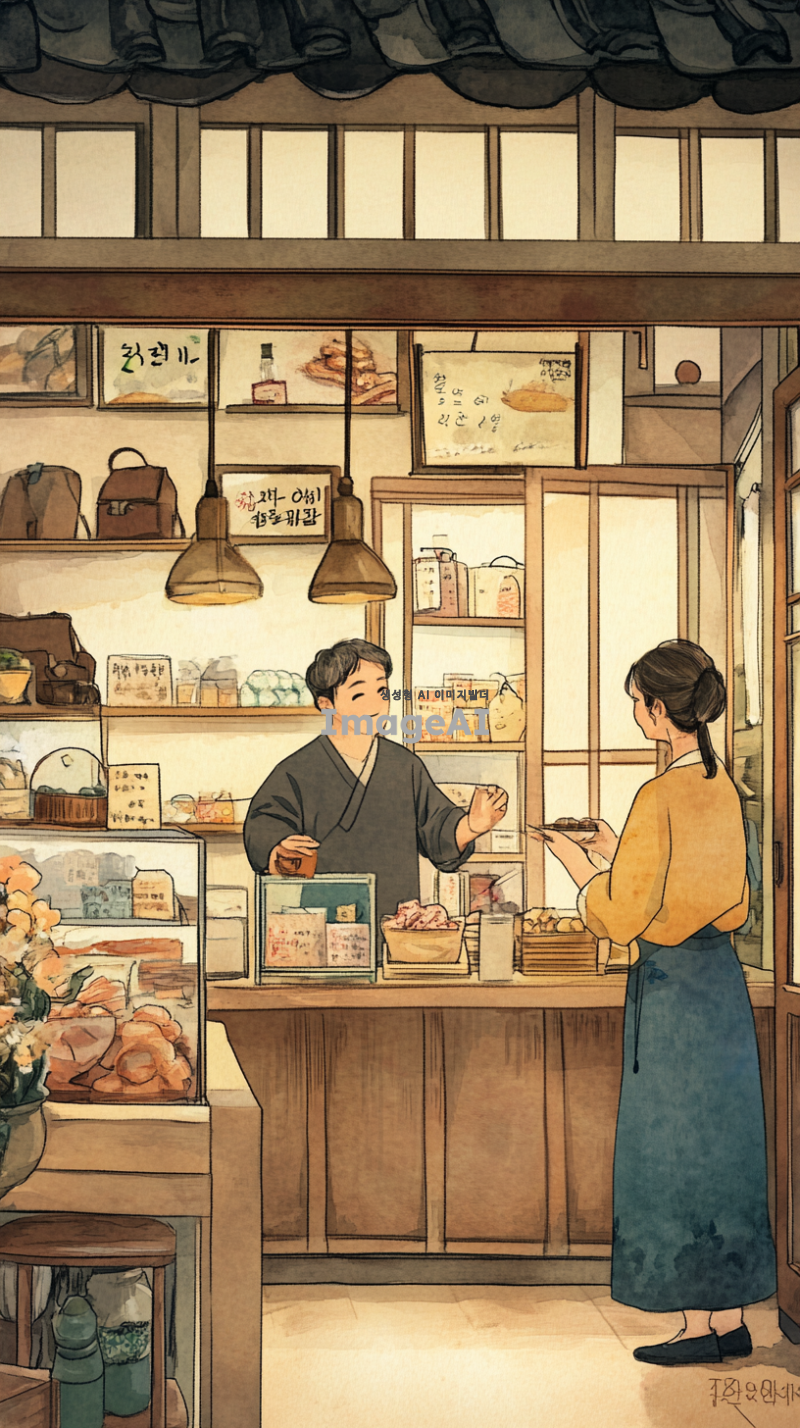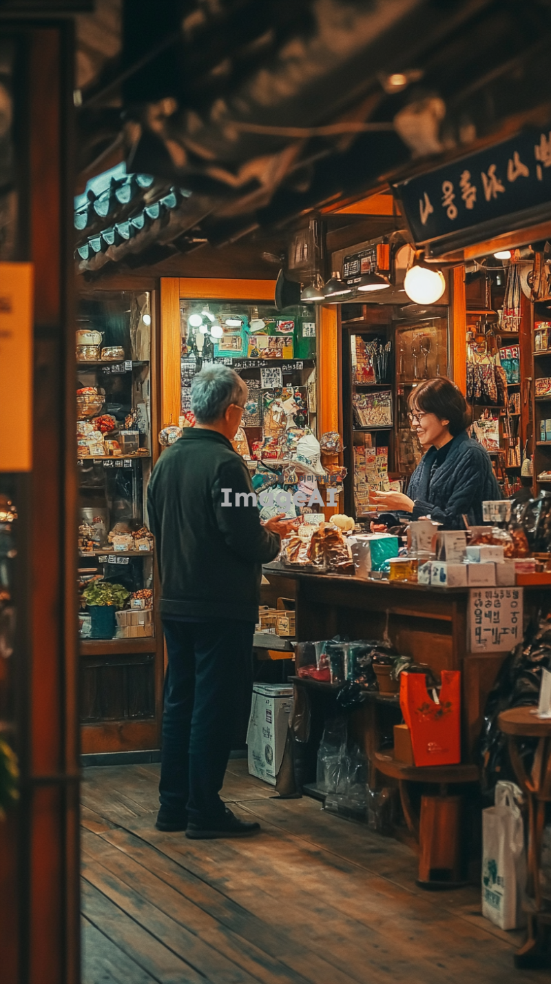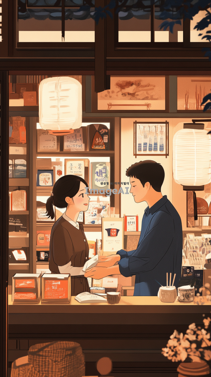 친한 형님과 아내에게 가게를 맡기고 있는 상황을 담은 이미지. 한국의 전통적인 가게 내부, 친근한 분위기에서 형님이 가게를 운영하고 있는 모습, 아내는 손님과 대화하고 있는 장면. 가게는 아기자기한 소품들로 꾸며져 있고, 따뜻한 조명이 비추는 가운데, 두 사람의 신뢰와 우정을 느낄 수 있는 장면.