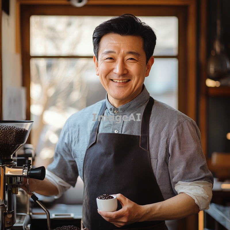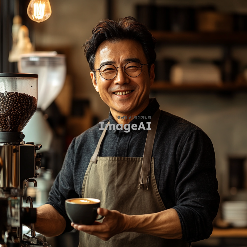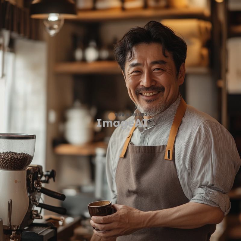 커피공방에서 일하는 아저씨의 모습, 중년의 한국 남성, 따뜻한 미소와 친근한 표정, 커피 원두와 커피 머신이 있는 아늑한 작업 공간, 자연광이 비치는 창가, 손에는 커피 컵을 들고 있는 모습, 편안한 작업복과 앞치마를 착용, 커피 향이 나는 편안한 분위기, 세심하게 커피를 내리는 모습, 디테일이 풍부하고 생동감 있는 스타일.