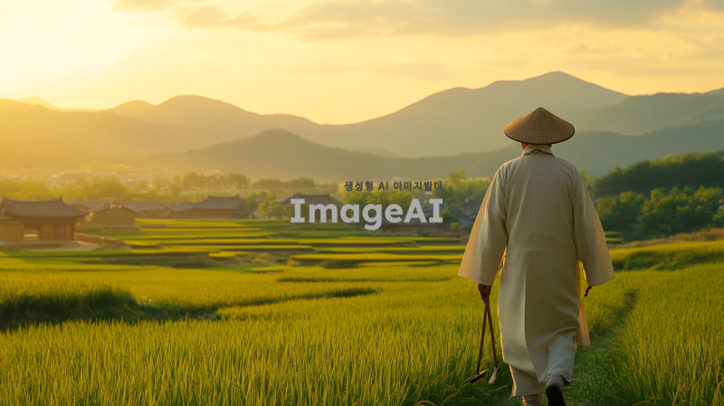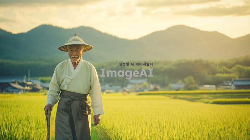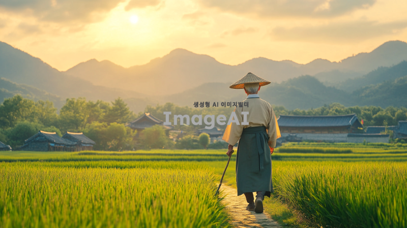 소로 밭으로 가는 한국의 할아버지, 전통적인 한복을 입고, 손에는 농기구를 들고 있는 모습, 배경에는 푸른 논과 산이 보이며, 따뜻한 햇살이 비치는 풍경, 16:9 비율.
