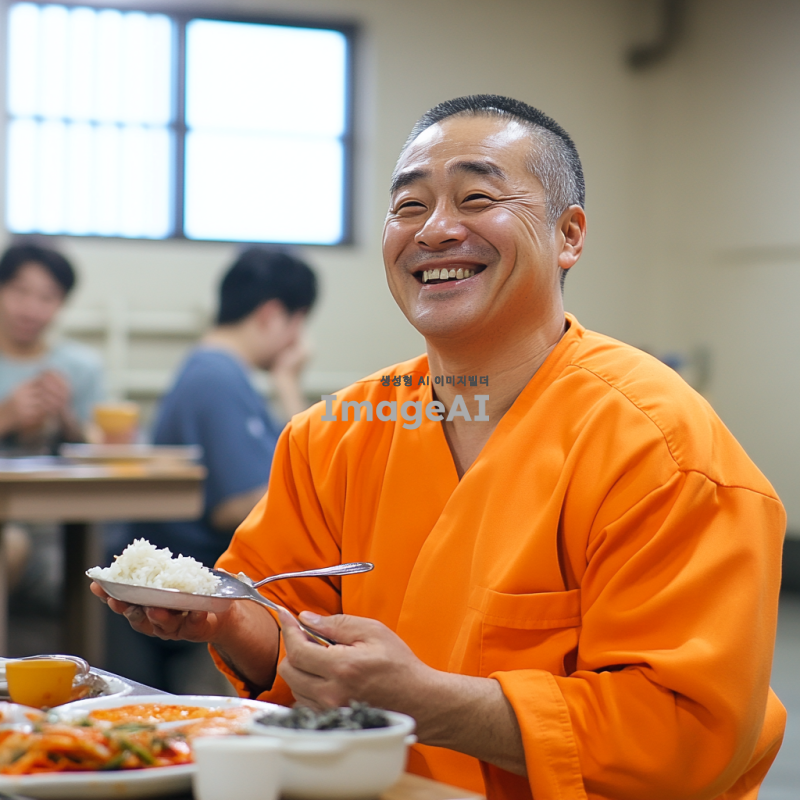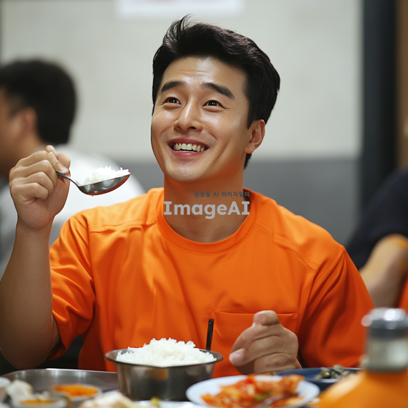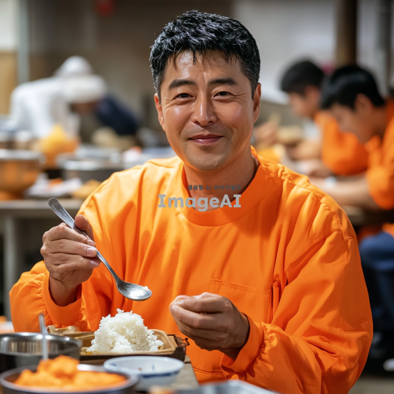 주황색 죄수복을 입고 있는 한국인 남성이 앉아서 밥을 먹고 있다. 그는 수저를 들고 있으며, 앞에는 다양한 반찬이 놓인 밥상이 있다. 얼굴은 밝게 웃고 있어 긍정적인 분위기를 자아낸다.