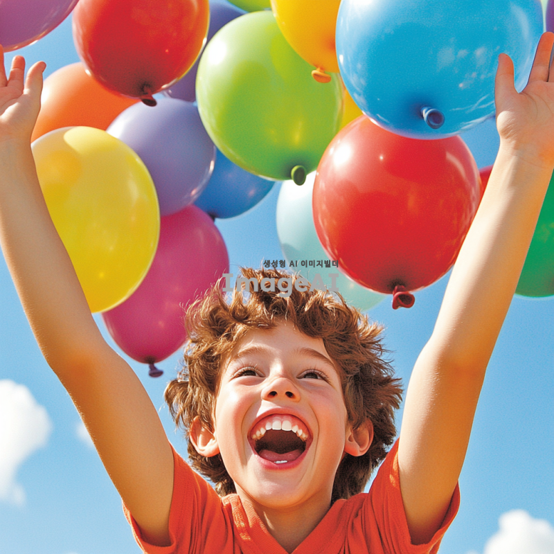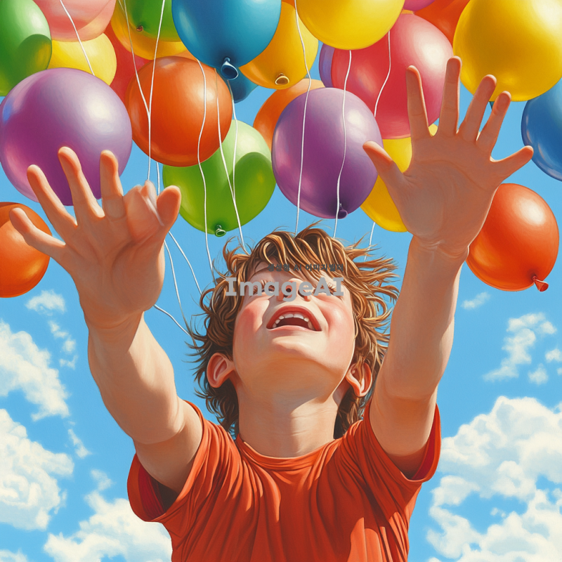 한 남자아이가 자신의 꿈과 희망이 담긴 풍선을 잡으려고 애쓰고 있는 모습. 아이의 머리 위에는 잡지 못한 다양한 색깔의 풍선들이 떠있고, 아이는 밝은 표정으로 풍선을 향해 손을 뻗고 있다. 배경은 푸른 하늘과 화창한 날씨로, 아이의 열정과 꿈을 상징하는 듯한 따뜻한 분위기를 연출한다.