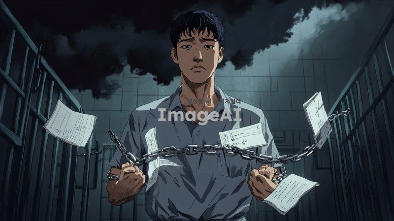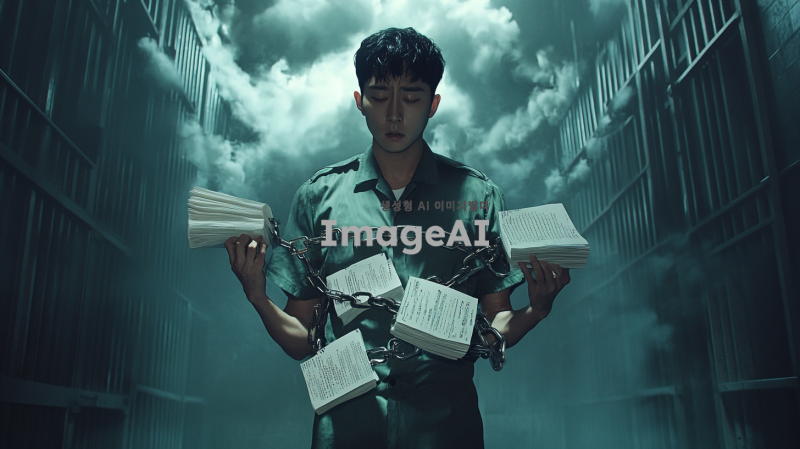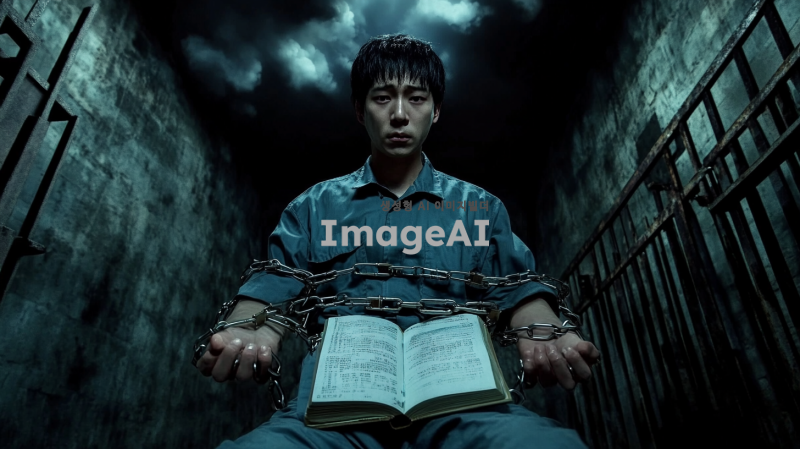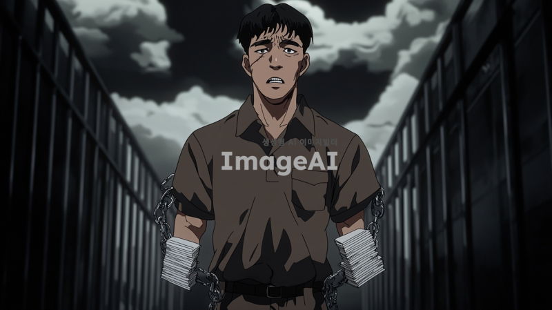 손목과 발목에 족쇄를 찬 한국인 남성이 죄수복을 입고 있는 모습. 족쇄는 시험지와 교과서로 이루어져 있으며, 배경은 어두운 감옥 환경으로 설정. 인물은 슬픈 표정을 짓고 있으며, 머리 위에는 비구름이 떠있다.