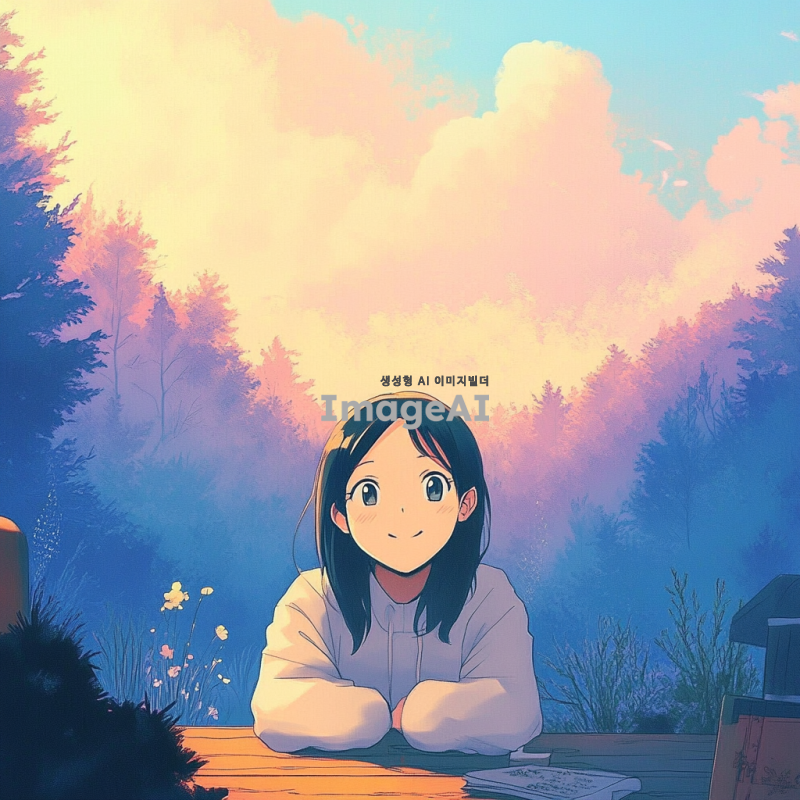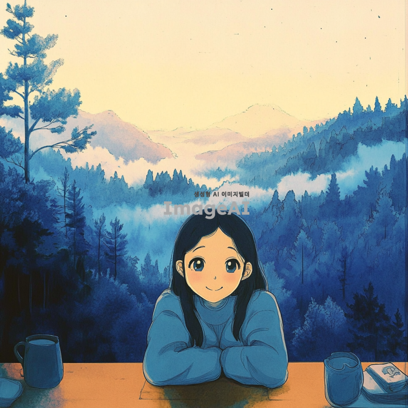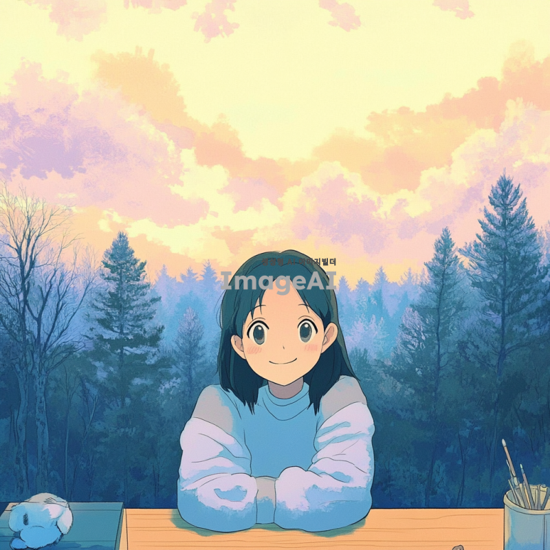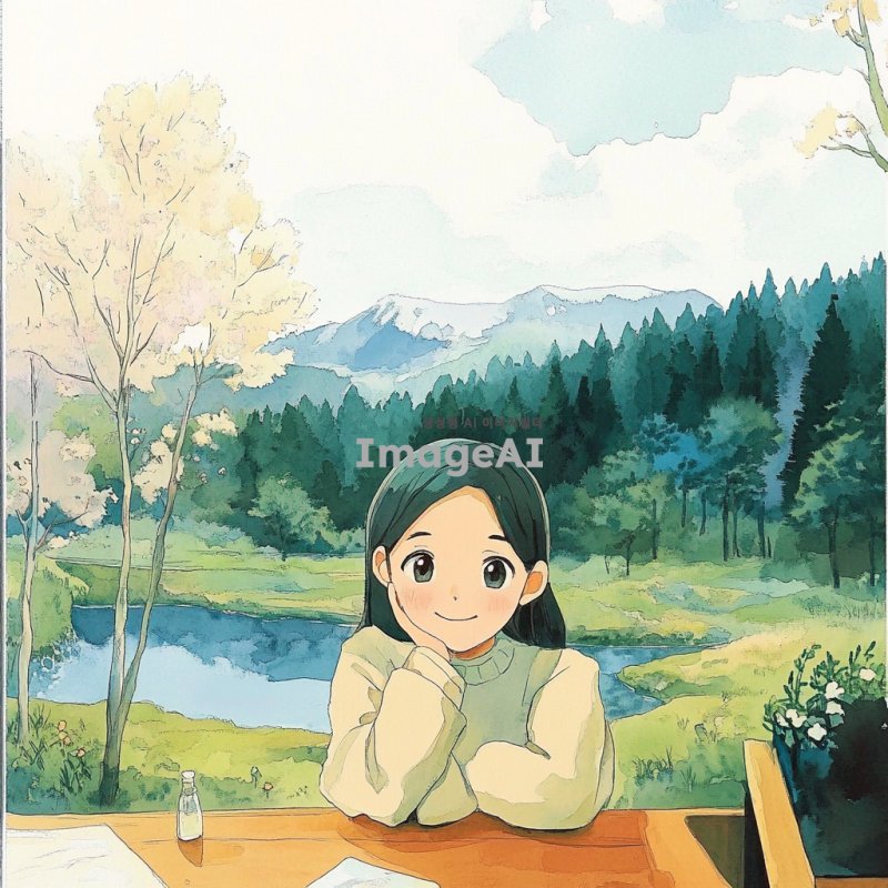 손으로 그린 듯한 따뜻한 감성의 풍경, 부드러운 파스텔톤 색감, 푸른 숲과 맑은 하늘, 몽환적인 분위기, 수채화 스타일, 일본 애니메이션 감성