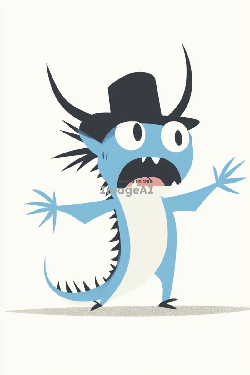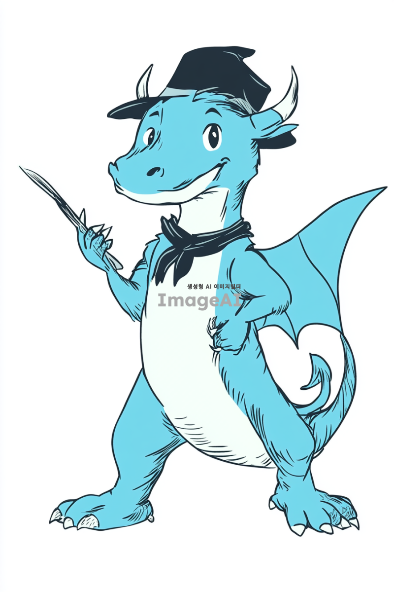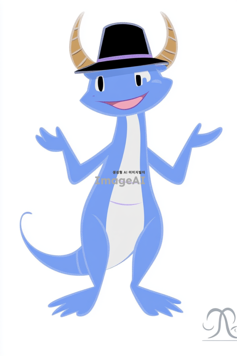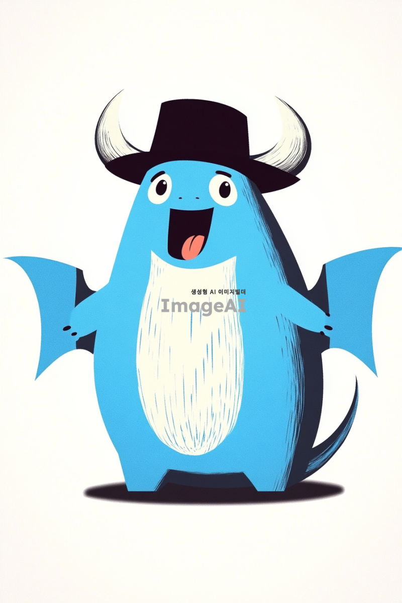 상상속의 동물인 청용(푸른 용)으로, 애니메이션 캐릭터 스타일로 렌더링되어 있으며, 파란색 몸에 검은 갓을 착용하고 있습니다. 배경은 순수한 흰색입니다. 머리 위에 두 개의 뿔이 있으며, 입을 벌려 혀를 내보이고 있으며, 단순한 디자인과 단순한 선, 평면 색 블록으로 구성되어 있습니다. 미니멀리스트 벡터 일러스트레이션으로, 벡터 그래픽 로고 디자인입니다. 주위에는 흰색 공간이 있습니다.