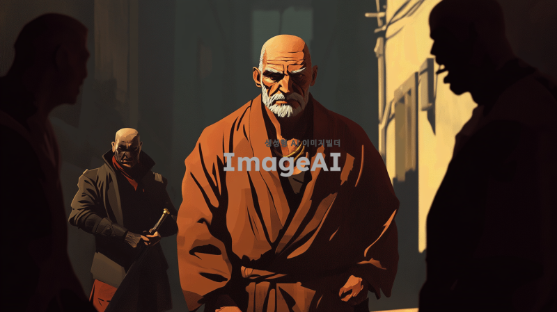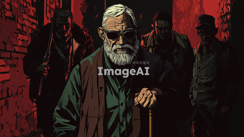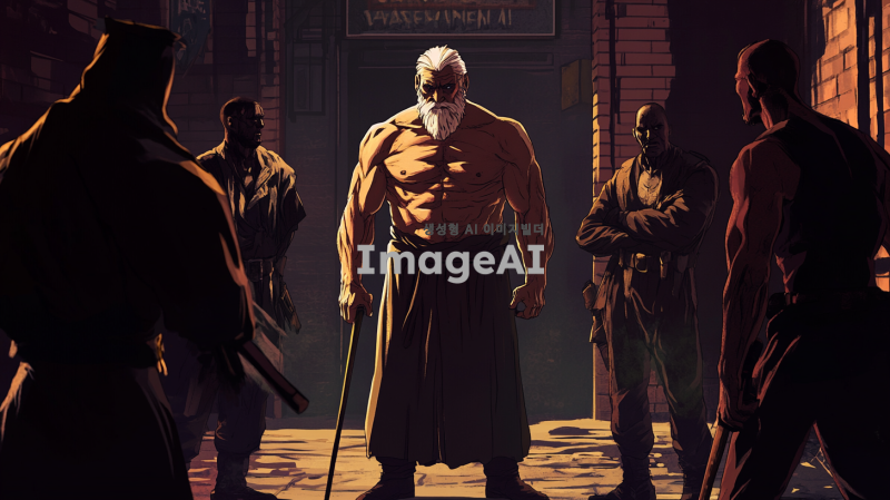 힘세고 지혜로운 노인이 세 명의 깡패들과 대치하고 있는 장면. 노인은 강한 체격과 깊은 주름이 있는 얼굴로 자신감 있게 서 있으며, 깡패들은 위협적인 표정으로 노인을 둘러싸고 있다. 배경은 어두운 골목길로, 긴 그림자가 드리워져 있고, 긴장감이 감도는 분위기. 노인의 손에는 전통적인 지팡이가 들려 있고, 깡패들은 다양한 복장으로 각기 다른 무기를 들고 있다.