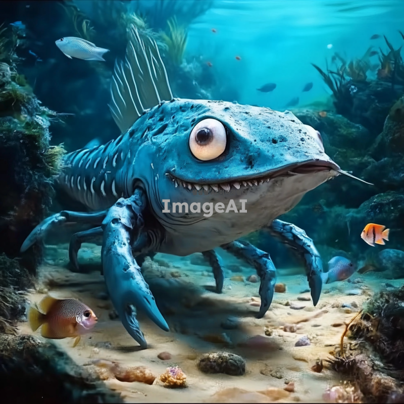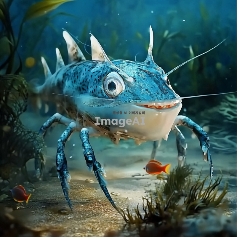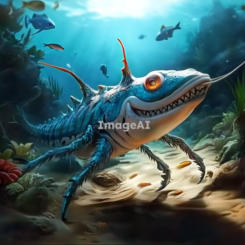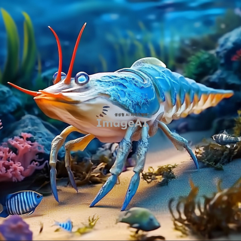 새우와 돌이 결합된 독특한 생명체, 바다 속에서 서식하는 모습, 생명체의 몸체는 새우의 형태를 가지면서도 돌의 질감과 색상을 지닌, 신비로운 분위기의 해양 환경, 주변에는 다양한 해양 식물과 작은 물고기들이 함께 있는 장면, 생명체의 눈은 지혜롭고 신비로운 느낌을 주며, 전체적으로 환상적이고 몽환적인 느낌을 강조하여 표현.