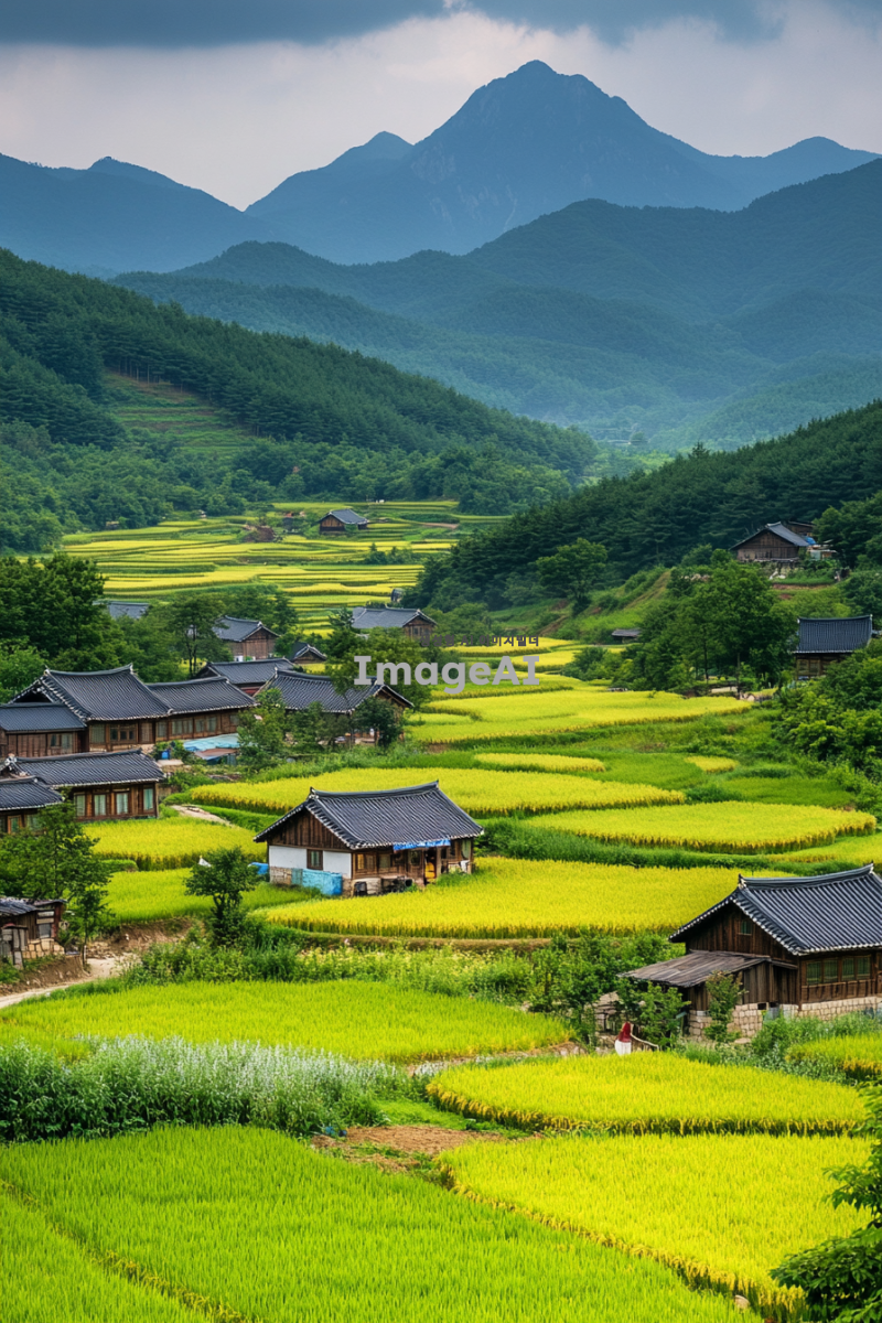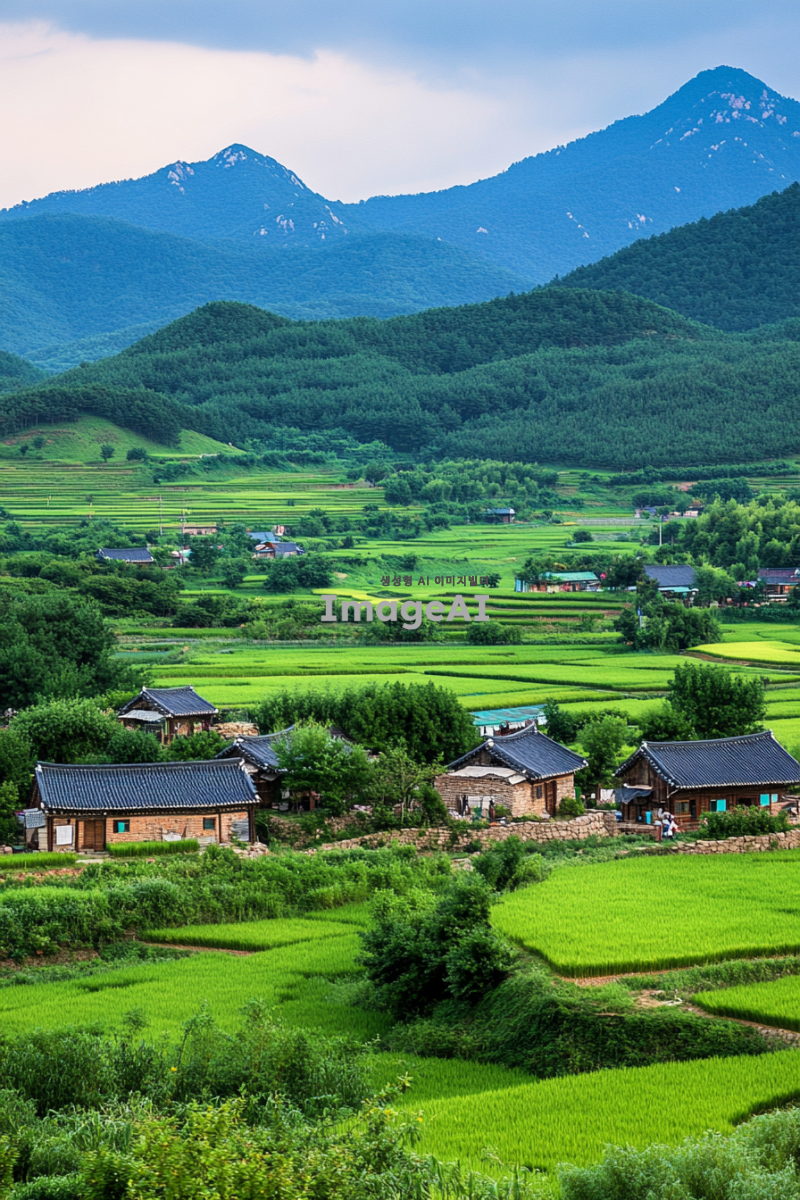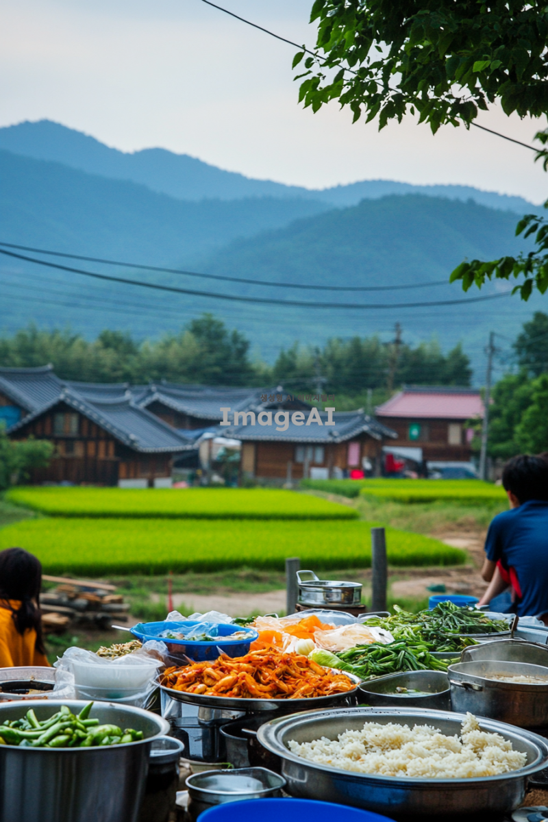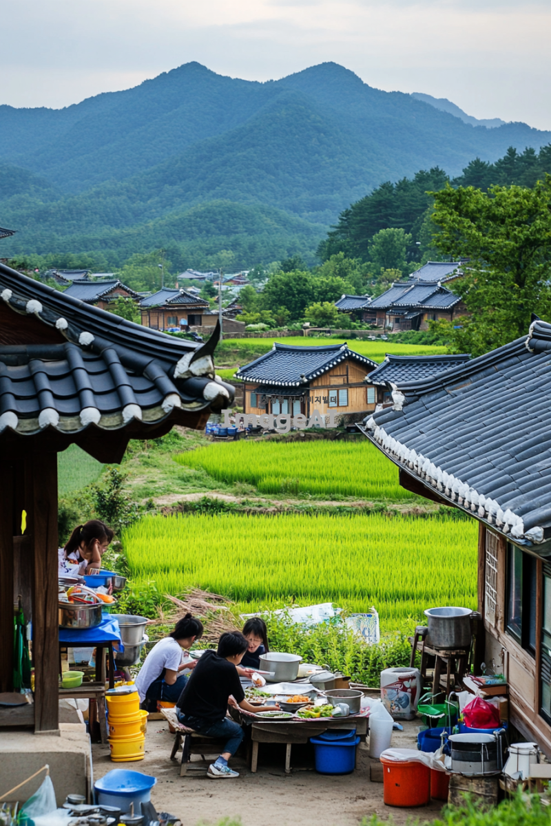 한국의 전통적인 시골 마을 풍경, 푸른 논과 산, 그리고 작은 집들이 있는 배경. 청소년들이 함께 모여 삼시세끼를 준비하는 모습, 신선한 채소와 쌀, 생선 등을 이용해 요리하는 장면. 밝고 활기찬 분위기, 웃음과 대화가 오가는 모습. 자연 속에서의 소박한 식사, 가족 같은 따뜻한 정이 느껴지는 순간.