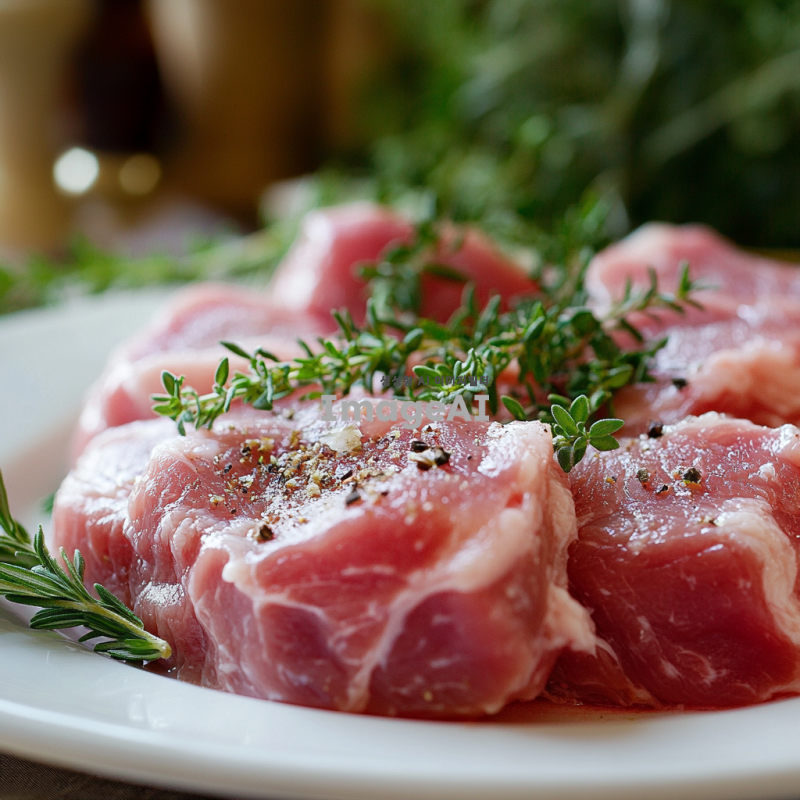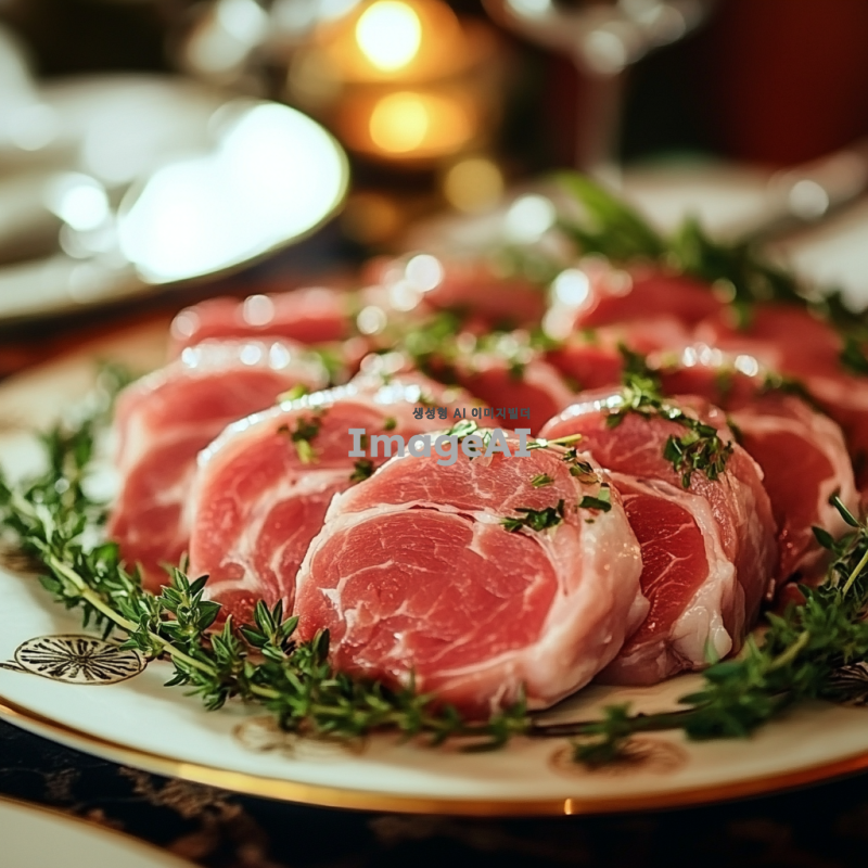 접시 위에 놓인 신선한 생돼지고기, 자연광 아래에서 반짝이는 핑크색의 고기, 주변에 신선한 허브와 함께 배치된 모습, 고기의 질감이 잘 드러나도록 클로즈업 촬영, 고급스러운 식탁 세팅과 함께 배경은 흐릿하게 처리된 모습.