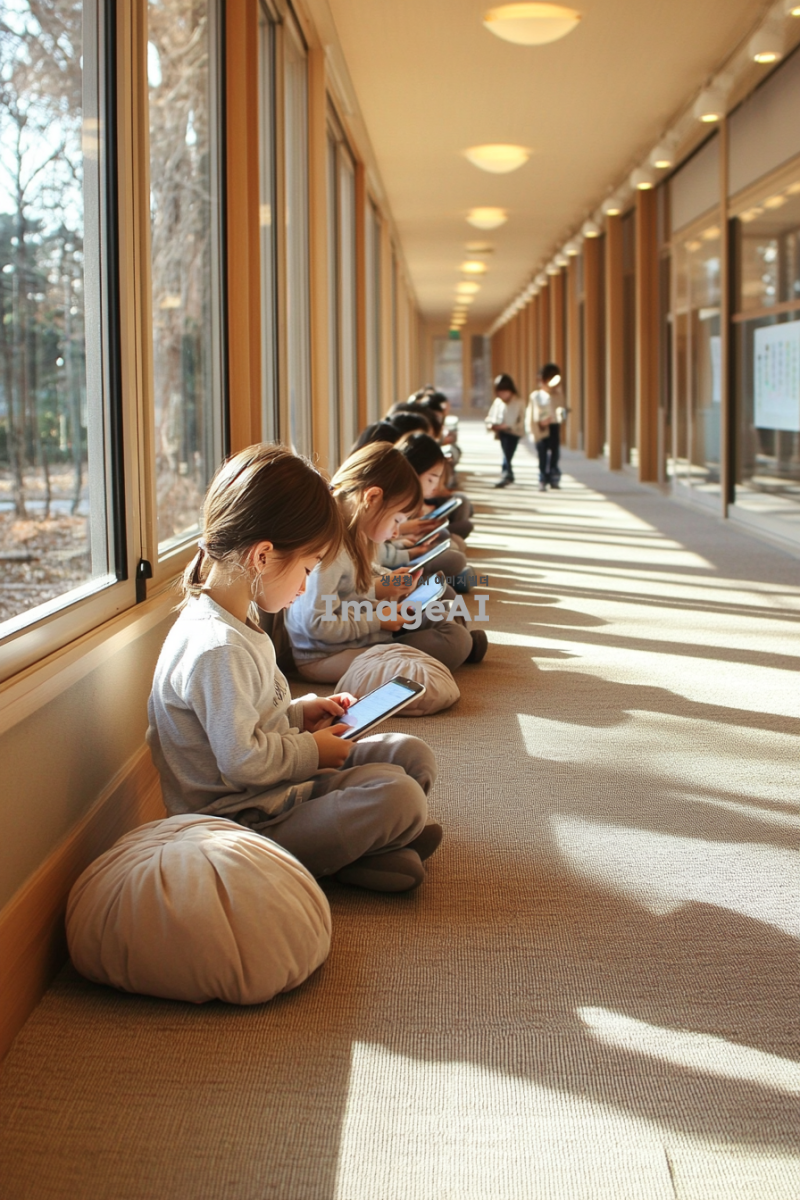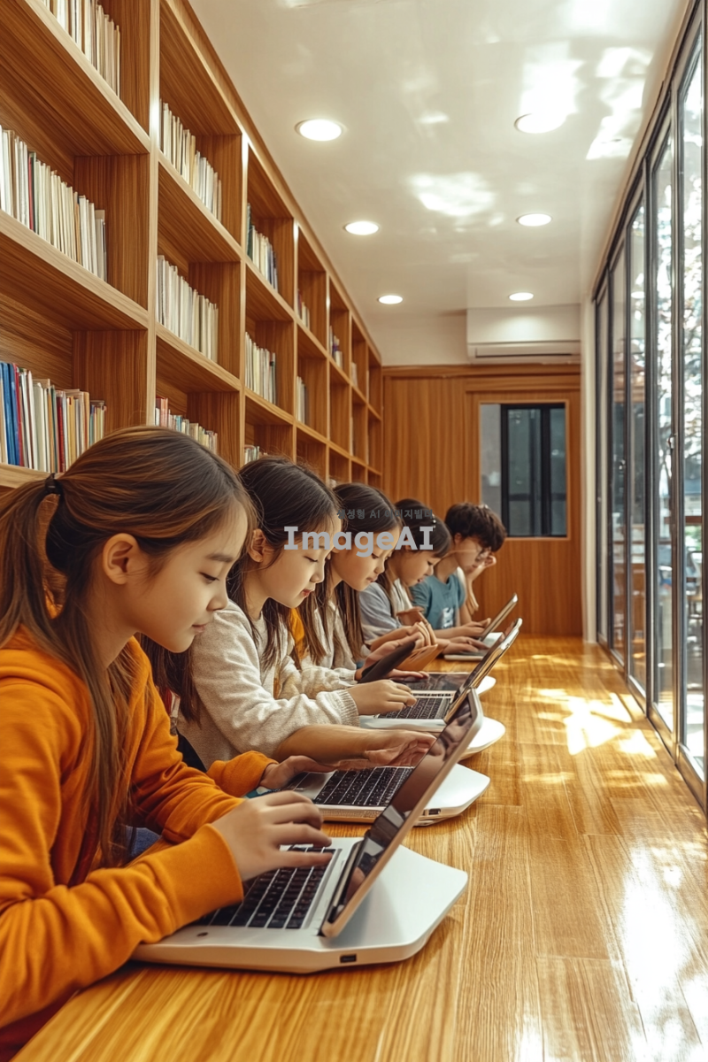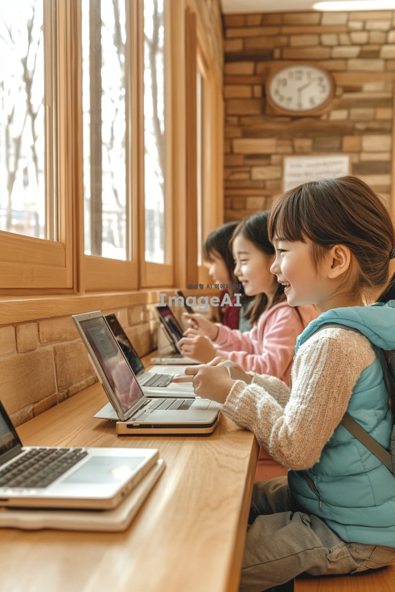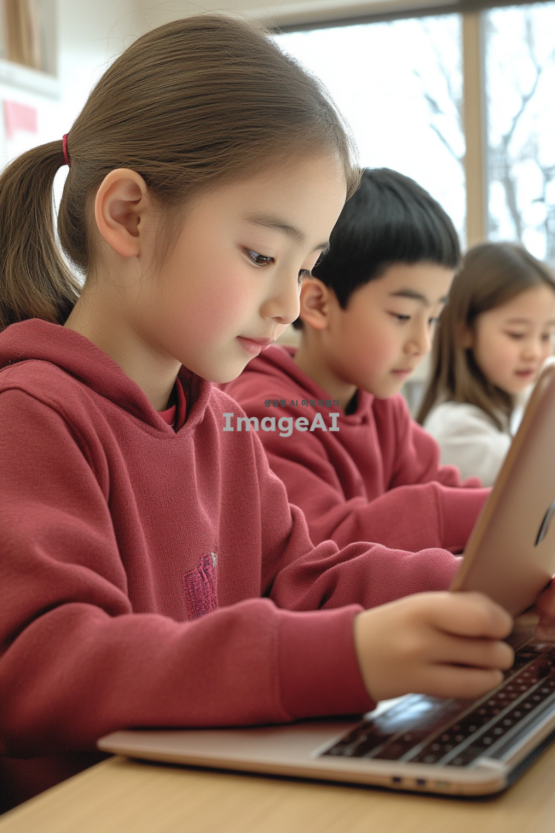 초등학교 교실에서 학생들이 디지털 기기를 사용하고 있는 모습, 각자 태블릿이나 노트북에 집중하고 있는 한국인 학생들, 교실의 따뜻한 분위기와 함께 학생들 간의 소통이 줄어든 상황, 디지털 기기 대신 서로 대화하며 놀이하는 모습과 대조되는 장면, 4차 산업혁명과 AI의 영향을 반영한 현대적인 교실 환경.