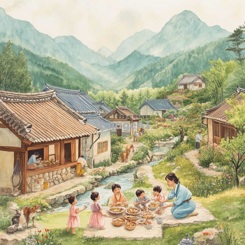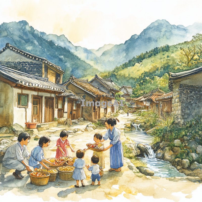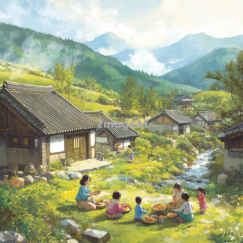 도덕적 가치와 인간의 존엄성을 강조하는 장면. 한국의 전통 마을에서, 서로 도와가며 살아가는 이웃들. 따뜻한 햇살 아래에서 아이들이 함께 놀고, 어른들은 정성껏 음식을 나누며 웃고 있는 모습. 배경에는 푸른 산과 흐르는 개울이 있고, 평화롭고 조화로운 분위기가 느껴지는 장면.
