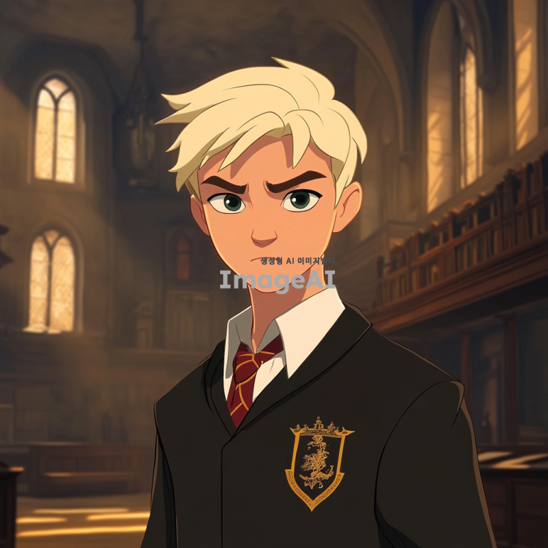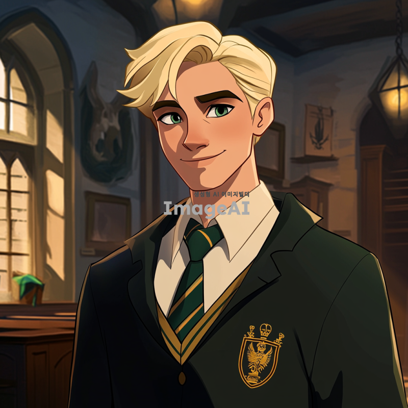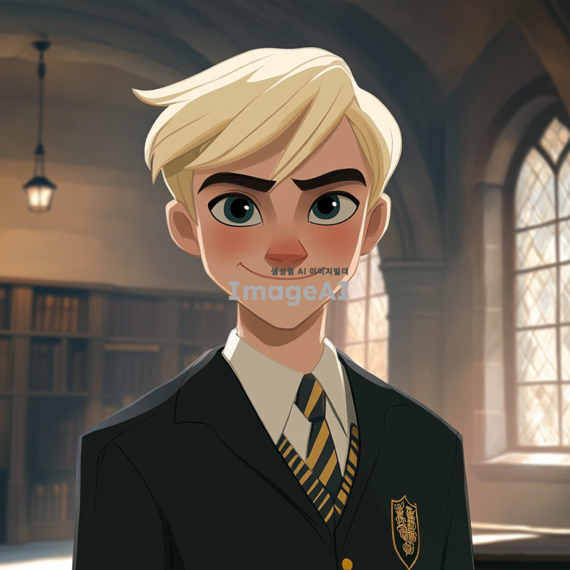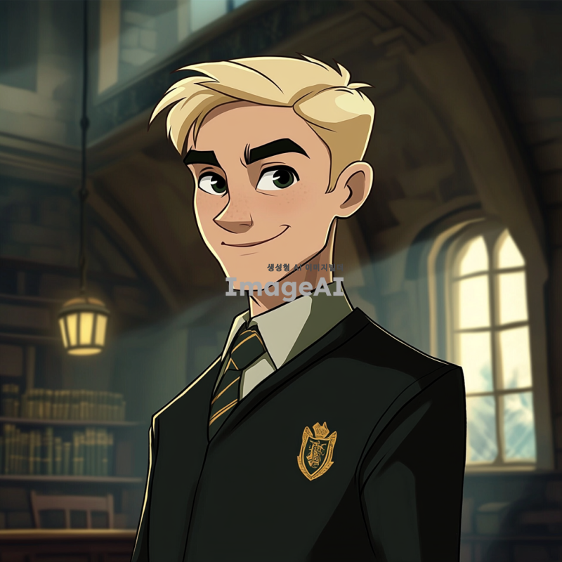 해리포터 시리즈의 드레이코 말포이를 2D 애니메이션 스타일로 묘사. 잘생기고 세련된 외모, 금발 머리와 차가운 미소, 호그와트 교복을 입고 있는 모습. 배경은 마법학교의 고풍스러운 교실이나 성곽 내부, 신비로운 분위기를 강조.