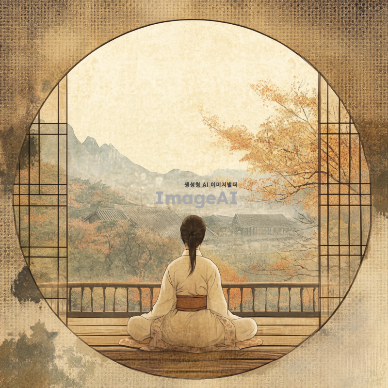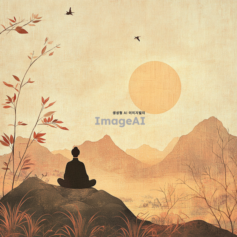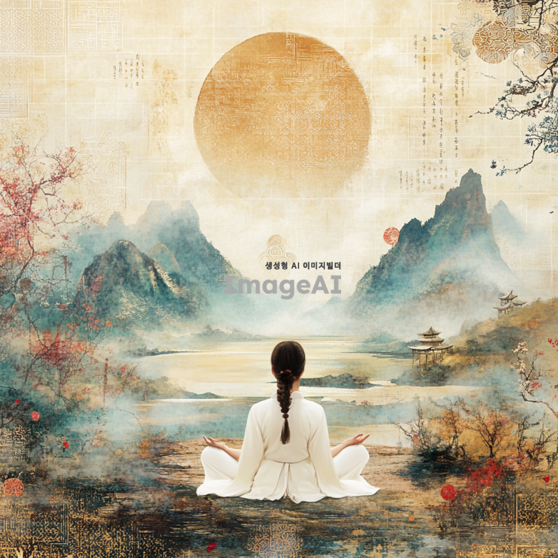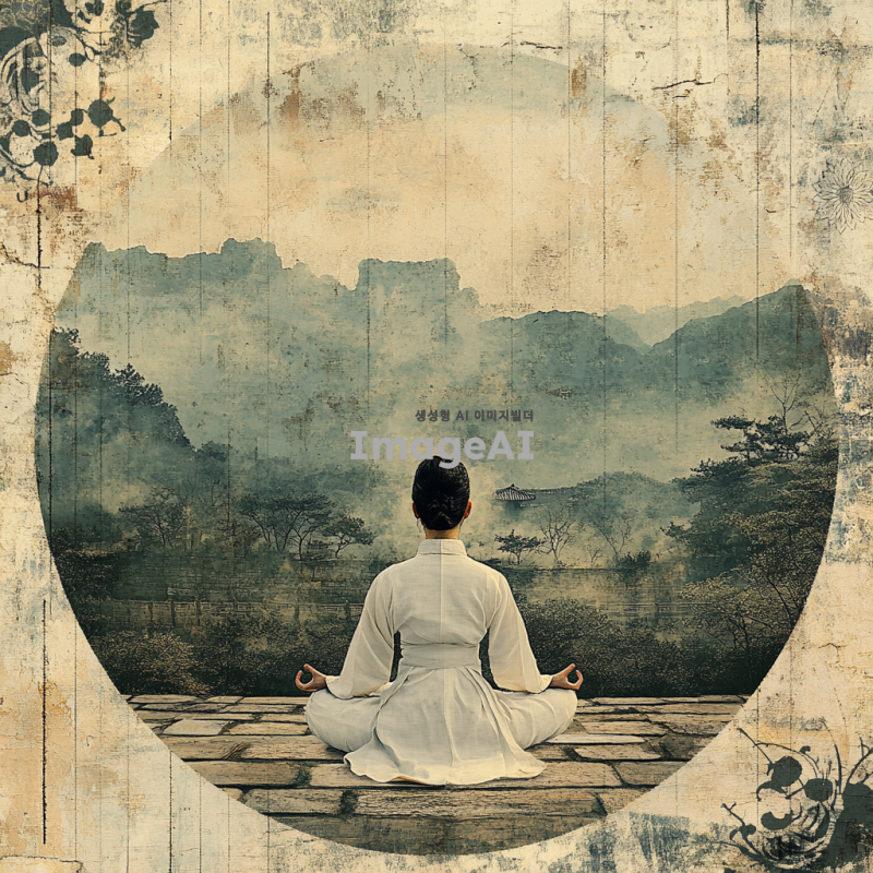 한국의 전통 사상인 일심사상을 주제로 한 이미지. 평화롭고 조화로운 자연 풍경 속에 명상하는 한국인 남성 또는 여성의 모습. 그들의 주변에는 동양의 전통 문양과 자연 요소들이 어우러져 있으며,부드러운 빛이 흐르는 따뜻한 분위기. 일심사상의 깊은 의미를 표현하기 위해 고요하고 명상적인 느낌을 강조.