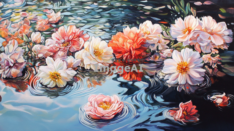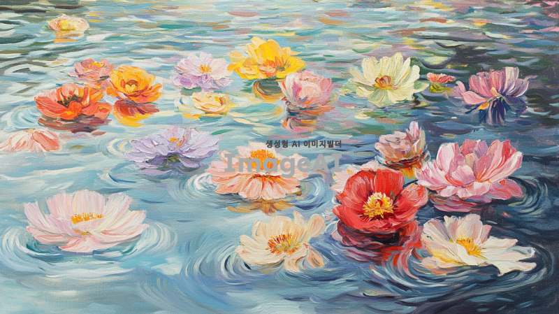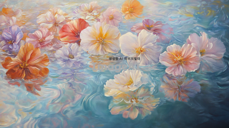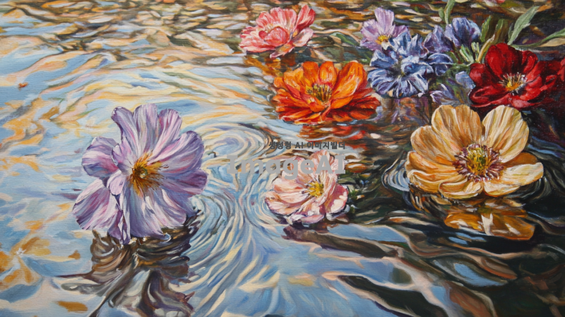 물에 띄어져 있는 여러 꽃들이 떠 있는 아름다운 장면을 아크릴로 그린 그림. 다양한 색상의 꽃들이 물 위에 떠 있으며, 햇빛이 비춰 반짝이는 물결과 꽃잎의 디테일이 생생하게 표현된 모습. 배경은 부드러운 파스텔 톤으로 물의 깊이와 꽃의 색감을 강조.