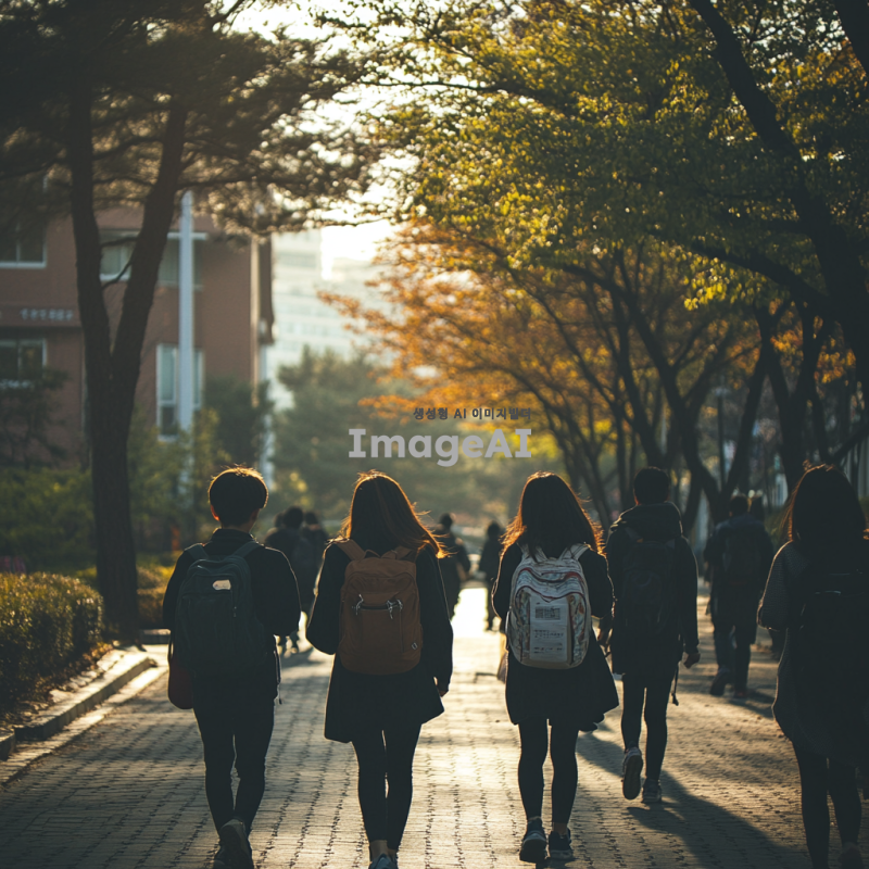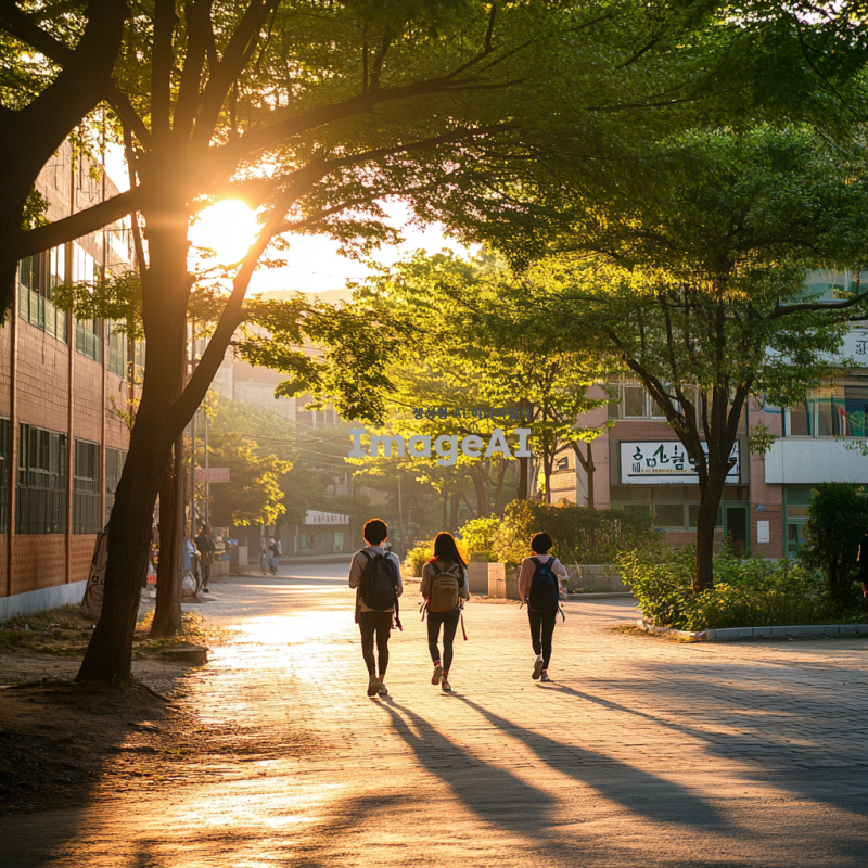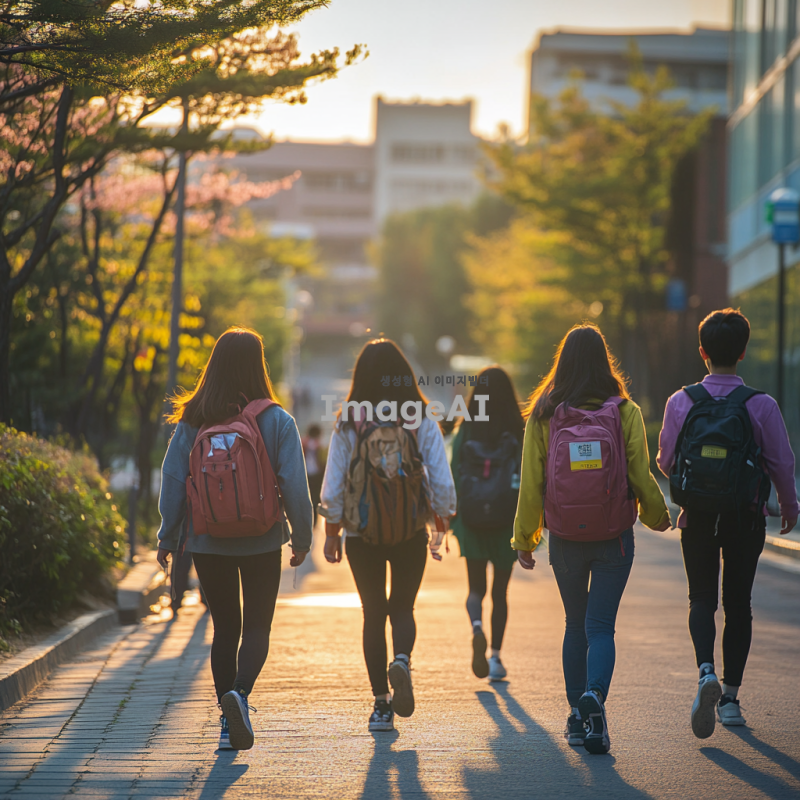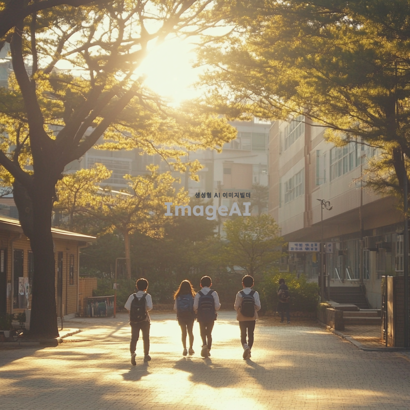 학교 끝나고 친구들과 함께 하교하는 길, 햇살이 따뜻하게 비추는 오후, 배낭을 메고 걷는 한국인 학생들, 한 명은 배고픔을 느끼며 손으로 배를 감싸고 있는 모습, 주변에는 학교 건물과 나무들이 어우러진 풍경, 밝고 경쾌한 분위기.