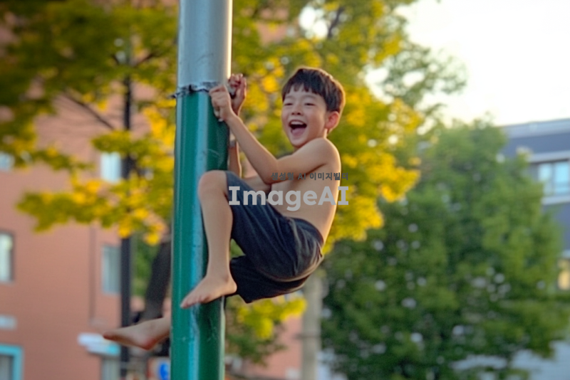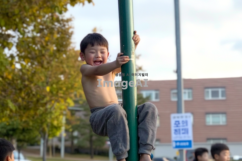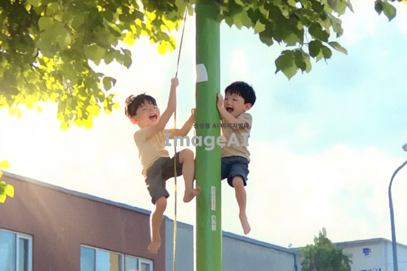 초록색 기둥에 매달려 즐겁게 노는 한국 남자 아이들. 아이들은 활기차고 웃고 있으며, 주변에는 푸른 잔디와 나무들이 어우러져 있는 공원 풍경. 아이들의 다양한 표정과 자세로 생동감을 표현하고, 햇살이 비치는 따뜻한 분위기를 연출해 주세요.
