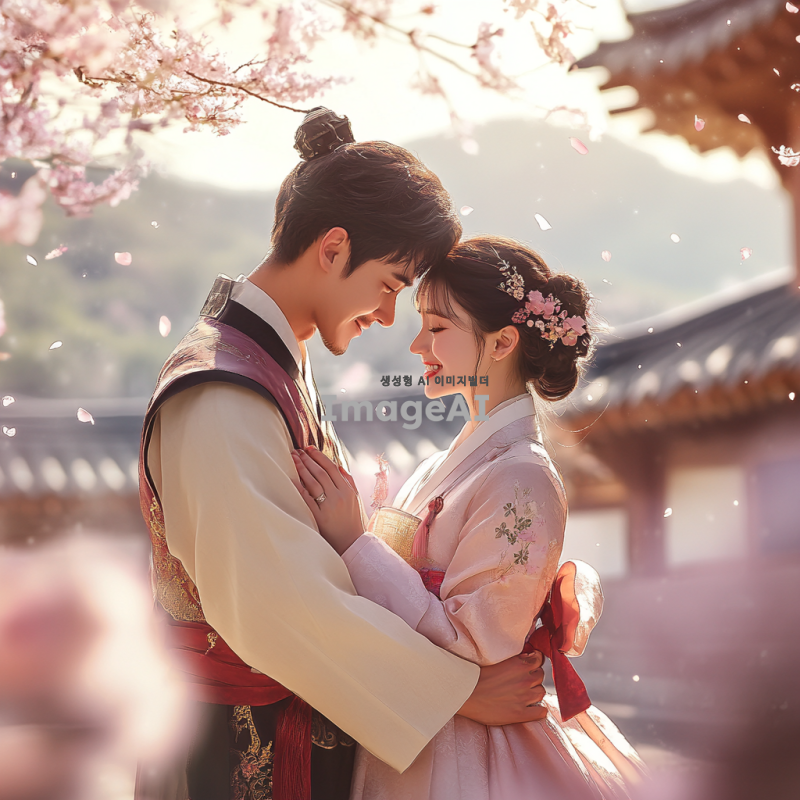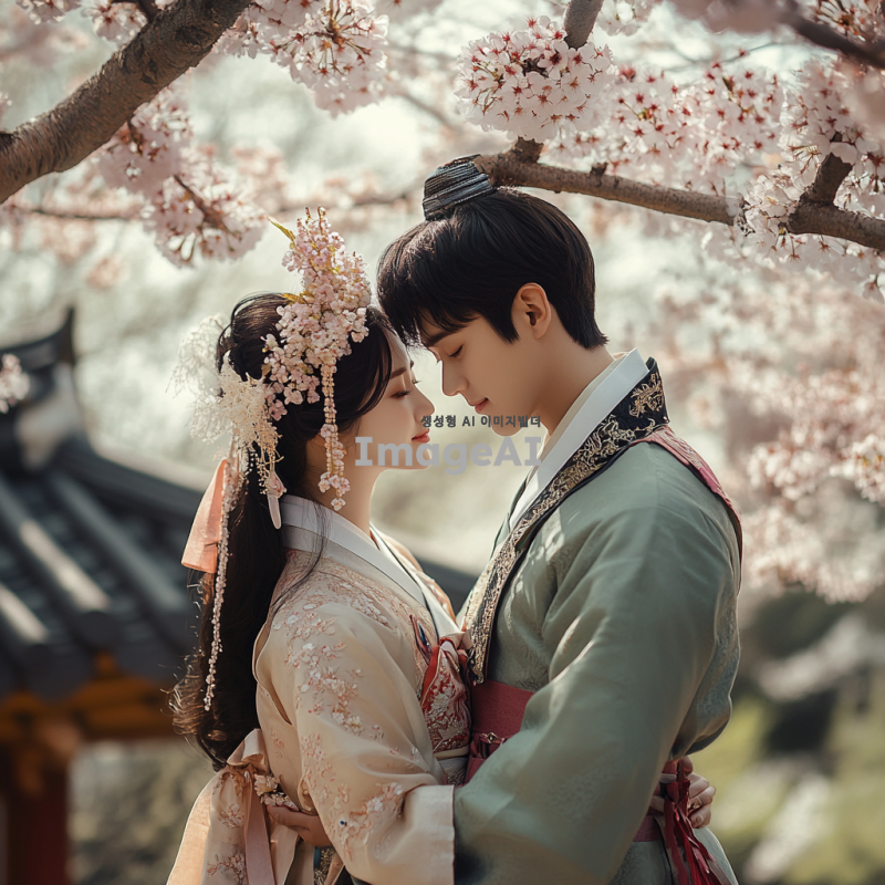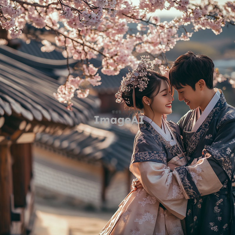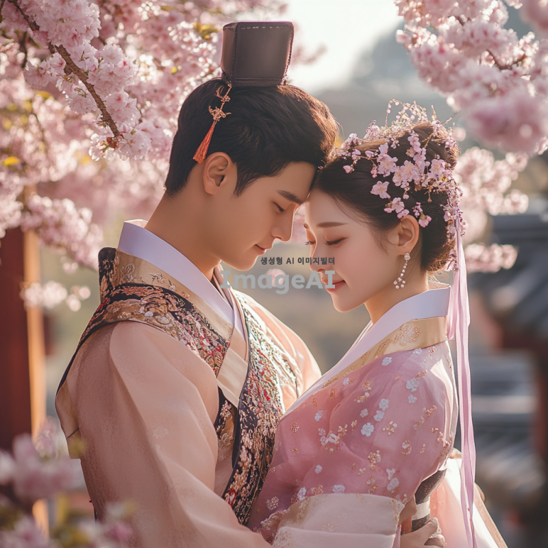 백제와 신라의 전통 의상을 입은 한국인 남녀가 서로 얼싸안고 있는 모습. 배경은 고대 한국의 풍경으로, 아름다운 자연과 함께 전통적인 건축물들이 어우러져 있다. 두 사람의 표정은 따뜻하고 우호적이며, 서로를 바라보는 눈빛에서 깊은 친밀감이 느껴진다. 주변에는 벚꽃이 만개해 있어 화사한 분위기를 더하고, 햇살이 부드럽게 비추는 장면을 연출한다.