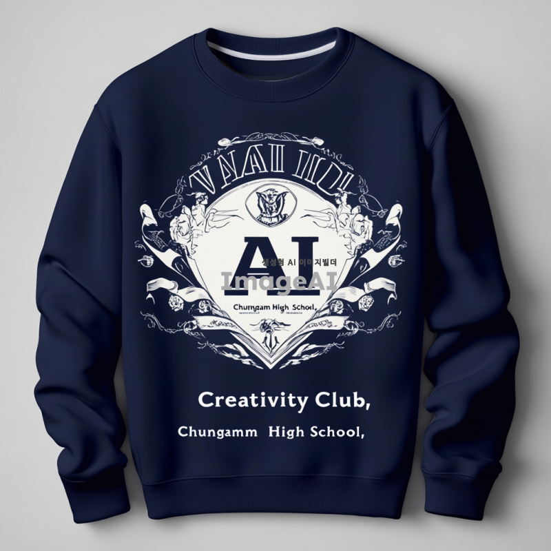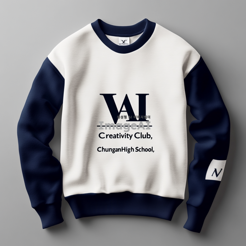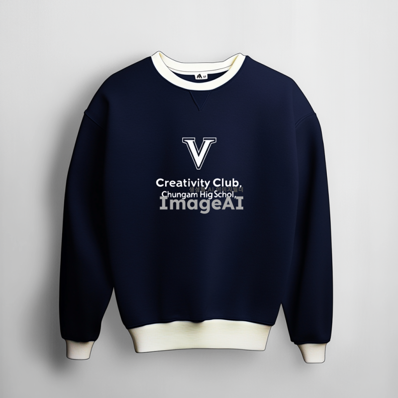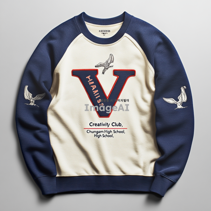 로고 디자인: VAIOS의 'V'를 강조한 심플하고 임팩트 있는 로고. 미국 대학교 과잠 스타일로, Harvard와 Yale의 클래식한 Varsity 폰트를 사용. 컬러는 로열 블루와 오프화이트 조합. 앞면에는 "AI Creativity Club" 텍스트가 포함되어야 하며, 옆면에도 동일한 로고가 들어가야 함. 고등학교 이름인 "충암고등학교"를 포함하여, 기모 소재로 캐주얼하고 모던한 느낌을 살린 과잠 디자인.