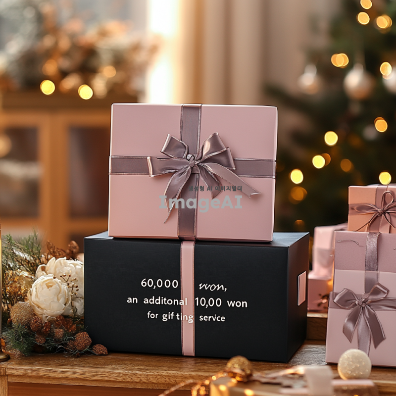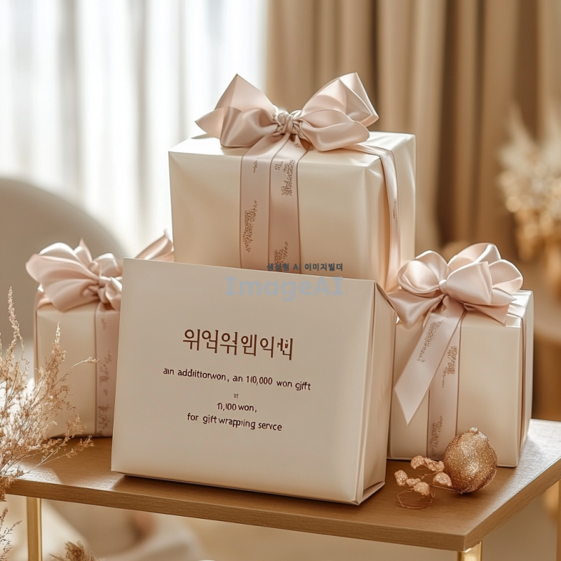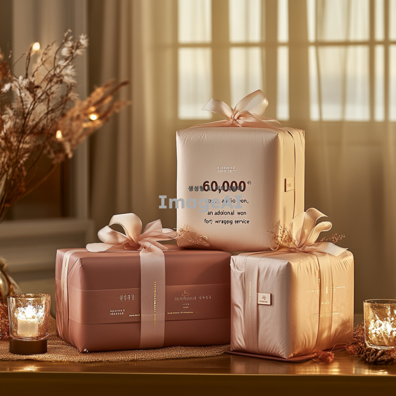 프리미엄 선물 패키징을 강조하는 이미지, 고급스러운 포장재와 함께 선물 상자가 놓여 있는 모습, 상자 위에 "6만원, 만원 추가로 선물 포장 서비스 제공"이라는 문구가 세련된 글씨체로 적혀 있는 장면, 따뜻한 조명 아래에서 포장이 돋보이도록 구성, 배경은 부드러운 색감으로 편안한 분위기를 연출.