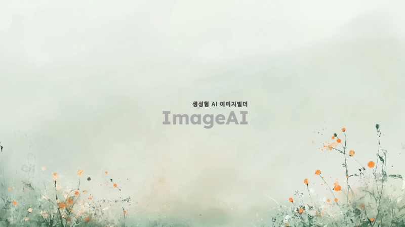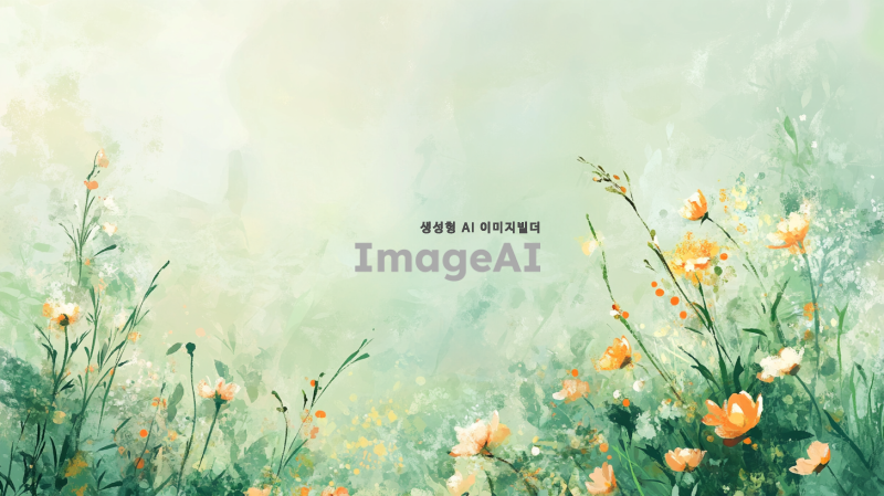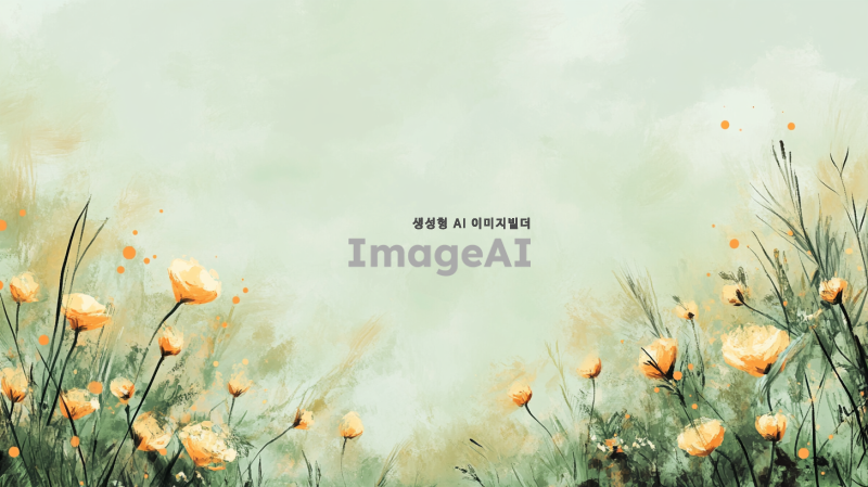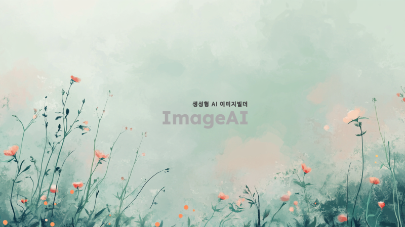부드럽고 파스텔 색상의 배경에 흐릿한 꽃들과 풀들이 캔버스 하단 가장자리에 있습니다. 하늘은 파스텔톤의 초록색으로 여름을 연상시키는 분위기를 만들어주며, 작은 주황색 점들이 구성에 깊이를 더합니다. 이 이미지는 디지털 드로잉과 페인팅의 배경화면으로 사용될 수 있습니다.