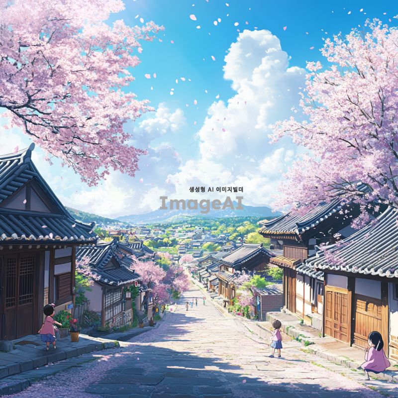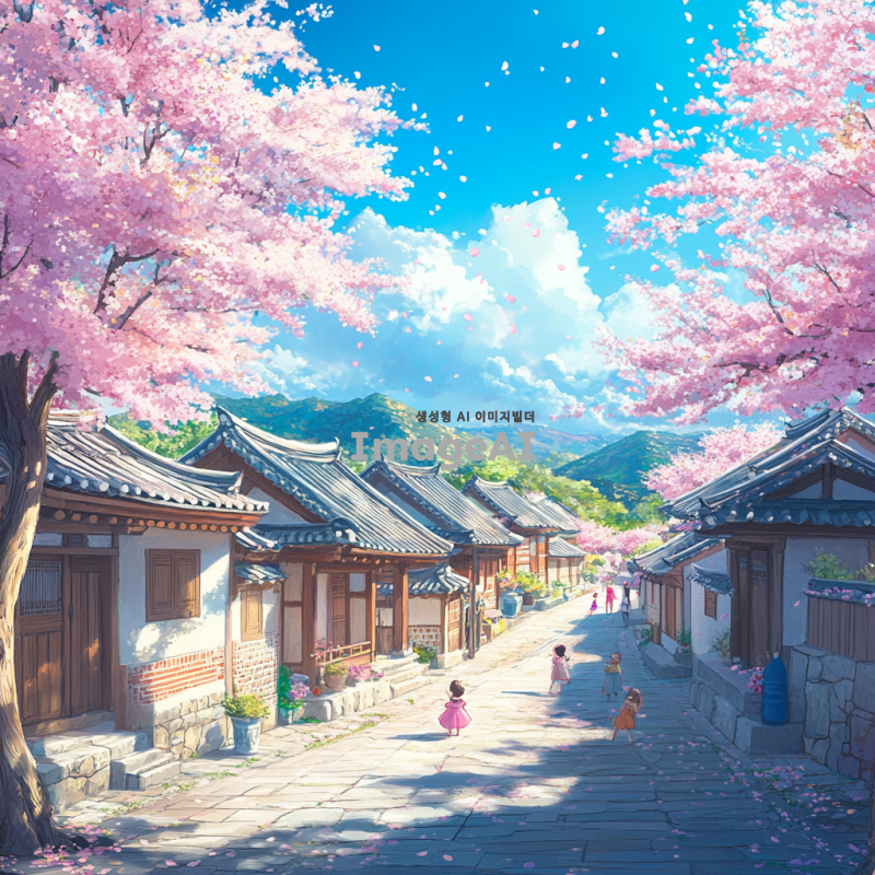 한국의 전통 마을 풍경을 배경으로, 푸른 하늘 아래에서 아름다운 벚꽃이 만개한 모습. 마을의 고즈넉한 한옥들이 줄지어 서 있고, 그 사이로 아이들이 뛰어노는 모습. 따뜻한 햇살이 비추고, 바람에 살랑이는 꽃잎들이 공중에 흩날리는 장면. 지브리 애니메이션의 따뜻하고 몽환적인 색감과 스타일로 표현된 이미지.