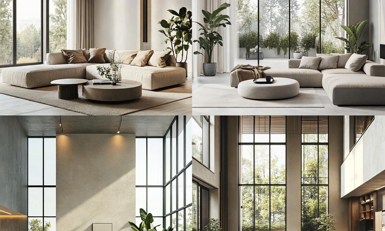 현대적인 거실 인테리어 디자인, 넓고 밝은 공간, 자연광이 가득한 큰 창문, 미니멀한 가구 배치, 중립적인 색조의 벽과 바닥, 아늑한 소파와 커피 테이블, 실내 식물로 포인트 추가, 조화로운 조명 배치, 편안하고 세련된 분위기