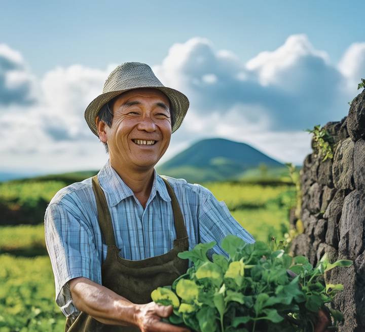 제주도의 푸른 하늘과 돌담을 배경으로 농부가 살짝 미소를 띠며 햇살 아래 작물을 손에 들어 올려 빛에 비춰보는 장면을 담아주세요. 농부의 손이 천천히 작물을 감싸며 건강함을 확인하고, 주변의 푸른 초원이 바람에 살짝 흔들리는 모습이 배경에 잡히도록 합니다. 장면이 전환되며 농부가 현무암 돌담 옆에서 작물을 가꾸는 모습을 보여주고, 자연 속에서의 편안한 미소로 마무리합니다.
