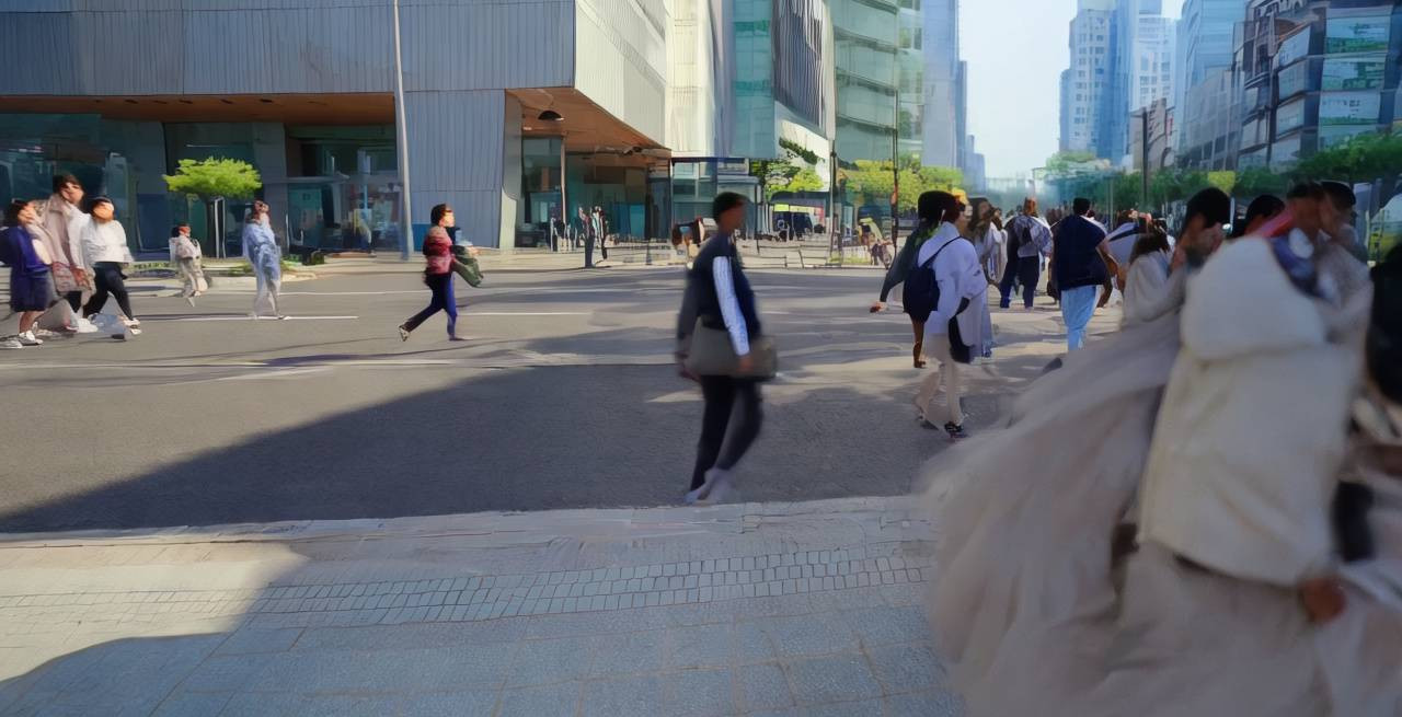 햇살이 밝게 비치는 도심의 한 거리, 아침 시간대. 배경에는 현대적인 건물들이 늘어서 있고, 거리에는 사람들이 바쁘게 움직이고 있다. 카메라는 도로 옆 인도를 따라 천천히 팬하며 휠체어를 탄 한국인 장애인이 등장한다. 그의 표정은 살짝 당혹스러워 보이지만, 밝고 귀여운 그림체 덕분에 부드럽고 따뜻한 느낌을 준다. 휠체어는 알록달록한 색감으로 디자인되어 있으며, 장애인의 옷차림도 경쾌하고 발랄하다. 카메라가 장애인의 시선으로 전환되며, 그 앞에 놓인 짧은 계단을 비춘다. 계단은 주변 환경과 잘 어우러지도록 깨끗하고 정돈된 모습이다. 조명은 자연광을 최대한 활용하여 부드럽고 따뜻한 분위기를 연출한다. 카메라는 다시 장애인을 비추며, 그는 잠시 고민하는 듯한 표정을 짓는다. 그 순간, 지나가는 행인이 그를 돕기 위해 다가오는 모습이 보이며 영상은 마무리된다.
