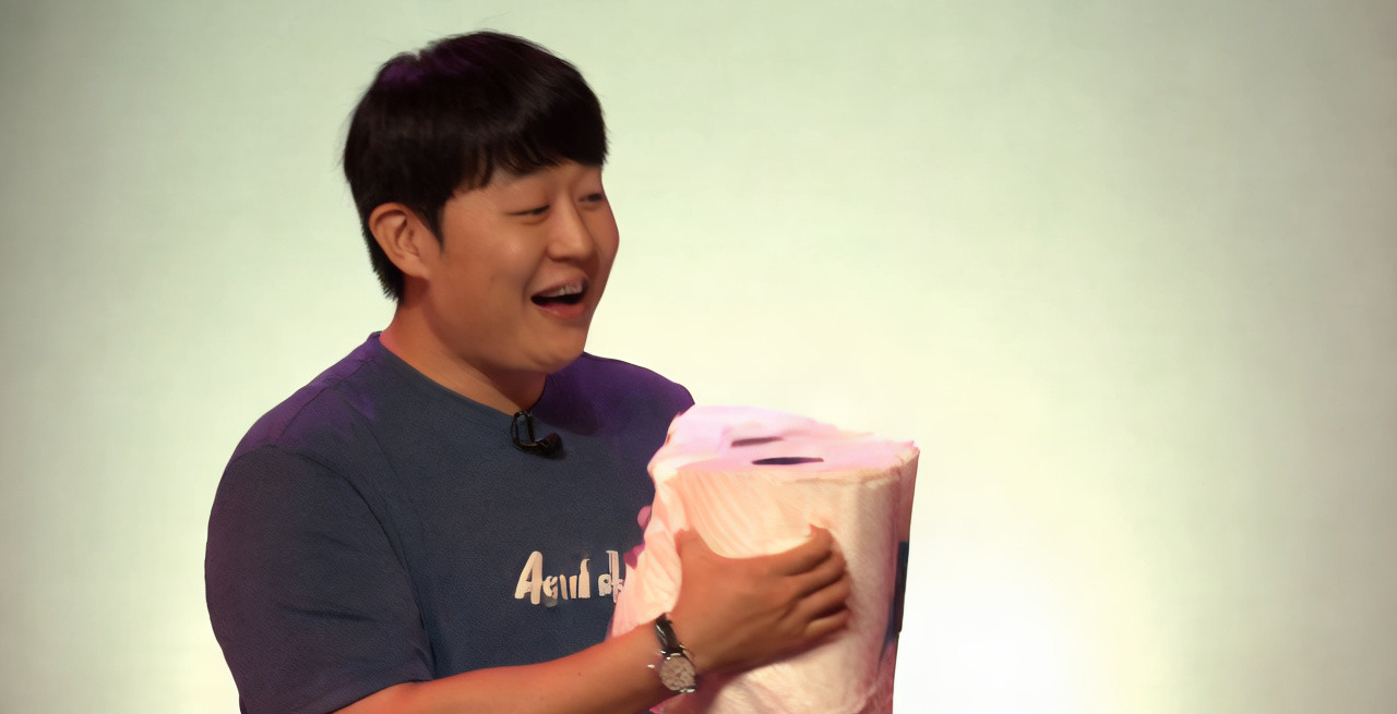 밝은 조명이 비추는 스튜디오에서 한국인 쇼호스트가 중앙에 서 있다. 쇼호스트는 활기차고 친근한 표정으로 두루마리 휴지를 들고 있다. 휴지에는 한글로 '안풀리는집'이라고 쓰여 있다. 배경은 깔끔한 흰색으로, 상품의 이미지가 돋보이도록 설계되어 있다. 카메라는 쇼호스트의 상반신을 중심으로 부드럽게 줌 인하며, 제품에 초점을 맞춘다. 살짝 오른쪽으로 팬 하면서 쇼호스트의 손짓을 따라가며, 휴지를 자세히 보여준다. 조명은 자연스럽고 따뜻한 톤으로 설정되어 있으며, 쇼호스트의 설명에 따라 휴지의 질감과 디자인이 잘 드러나도록 한다. 분위기는 경쾌하고 신뢰감을 주는 느낌으로 연출되어, 시청자들이 제품에 대한 관심을 가질 수 있도록 한다.