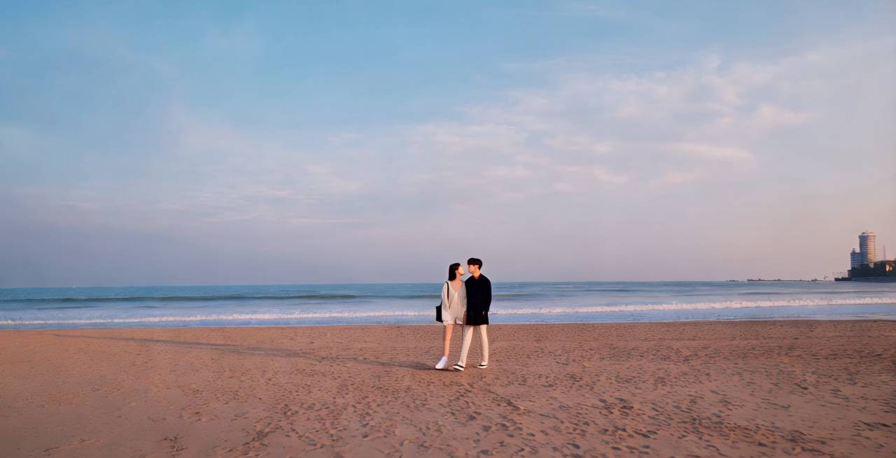 푸른 하늘이 펼쳐진 해변가, 햇빛이 부드럽게 비치는 늦은 오후. 바닷바람이 살랑이는 가운데 파도가 잔잔하게 밀려와 모래사장을 적신다. 젊은 한국인 남성과 여성이 해변을 거닐며 서로를 바라보며 분위기가 익는다. 남성과 여성이 서로 가까이 다가가며, 그들이 서로의 눈을 바라보다가 격정적이게 키스 하는 순간을 담는다. 주변의 소음은 잔잔하게 줄어든다. 전체적인 분위기는 뜨겁고 애로틱 하며 야하다.