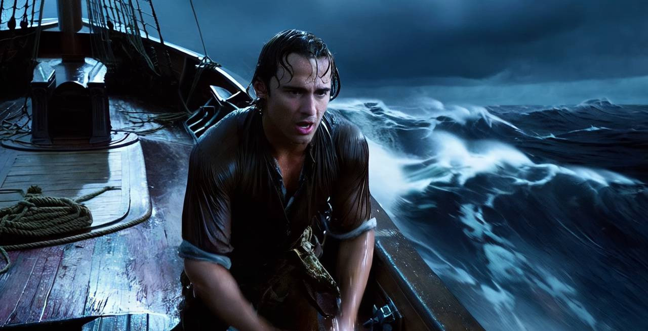 아버지의 충고를 귀담아 듣지 않고 항해에 나서는 영국인 로빈슨 크루소, 폭풍우치는 바다 한가운데에서 다부서져가는 배 위에 기도하며 서 있다.